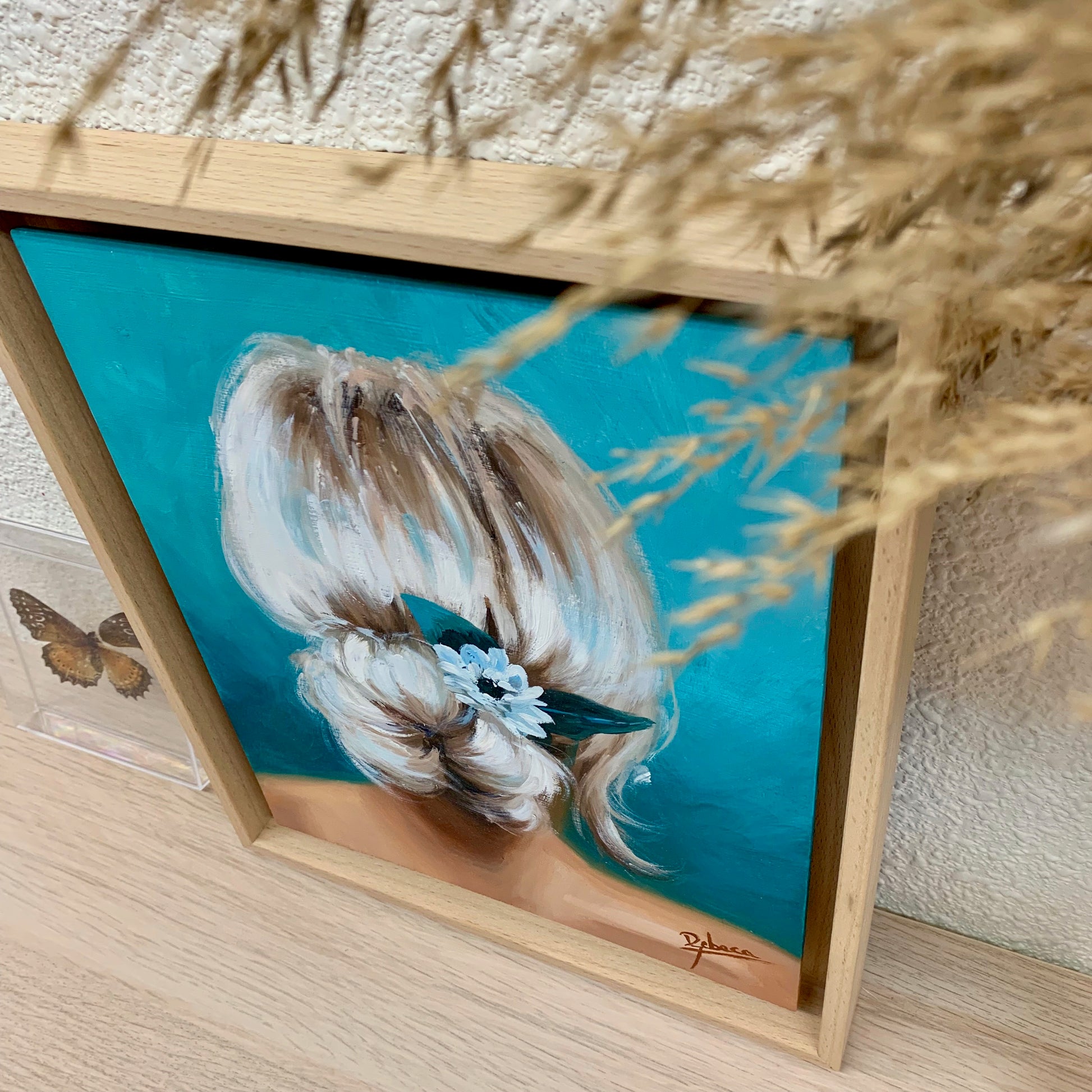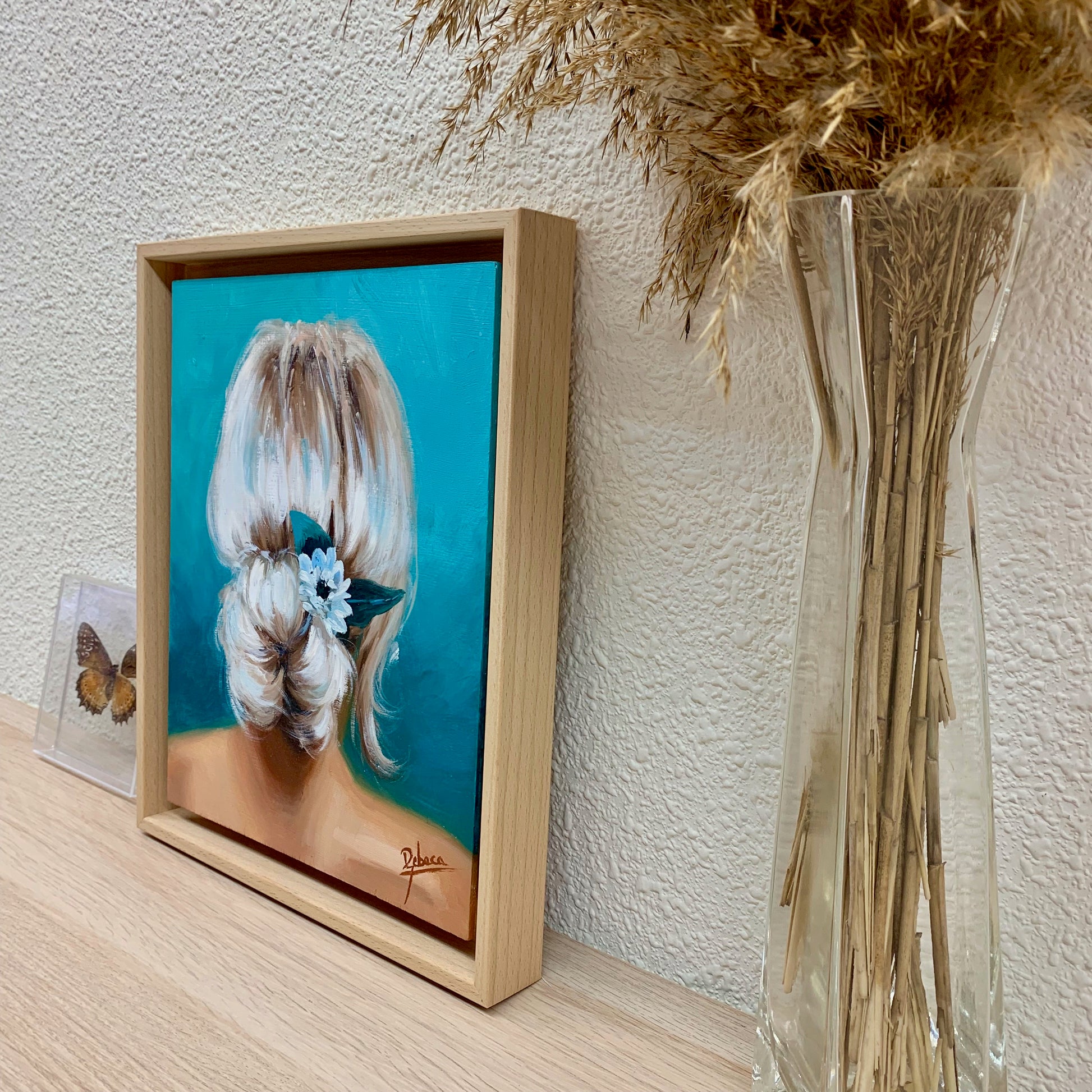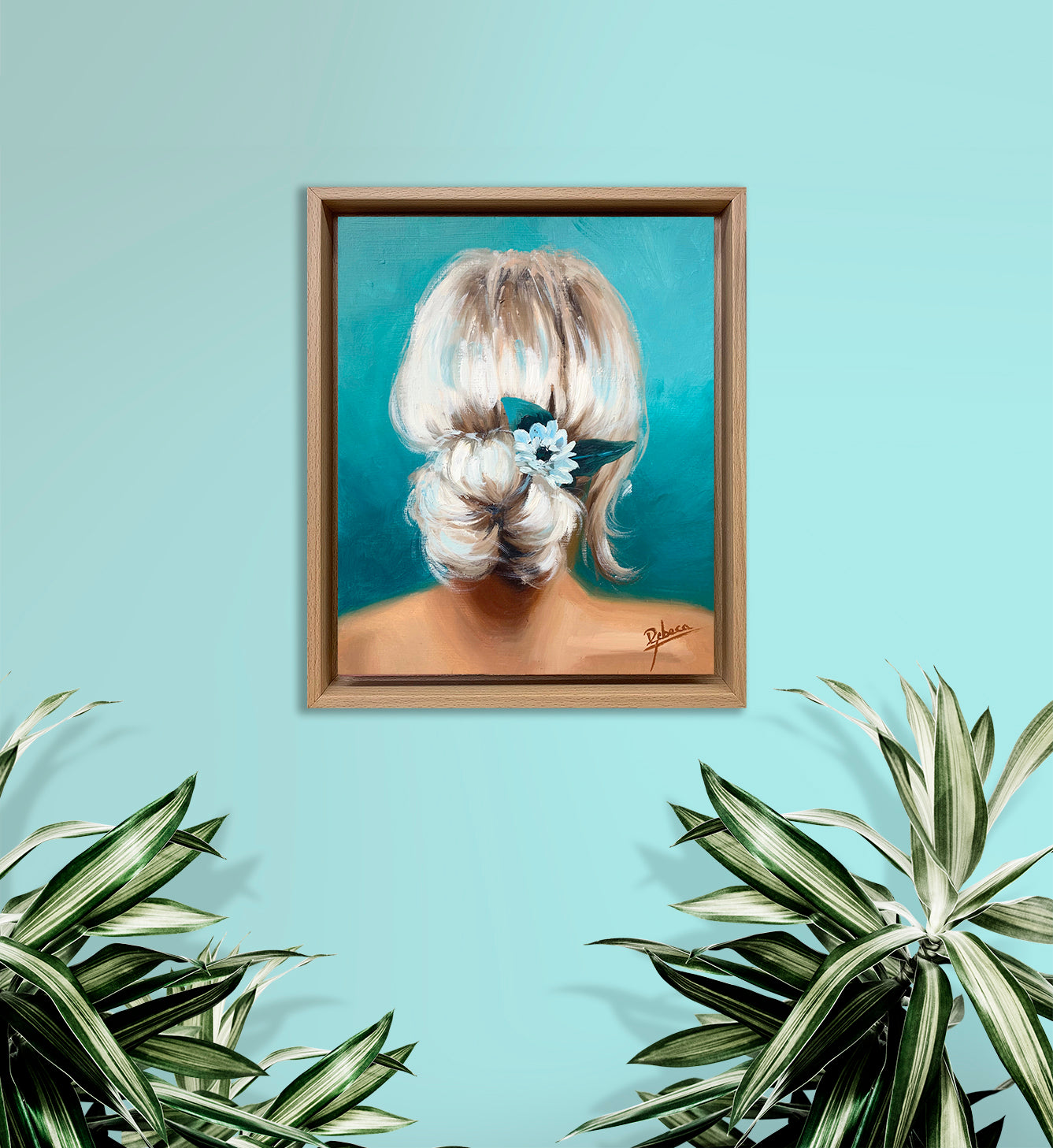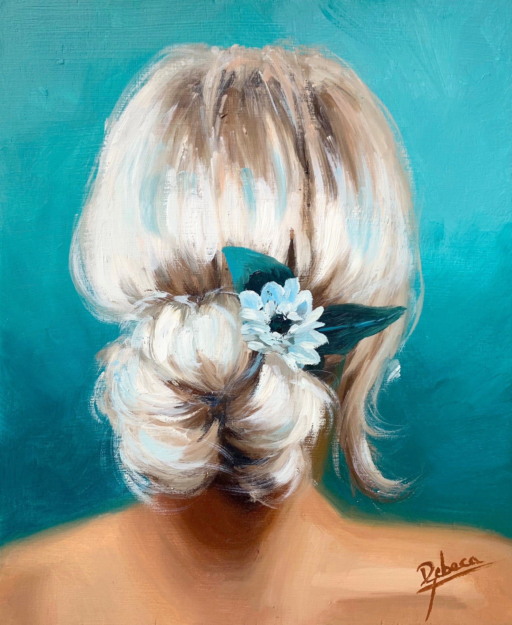 CF18. Una pintura al óleo que combina frescura y elegancia en una escena íntima: un recogido rubio adornado con una flor blanca y hojas verdes que contrastan con el vibrante fondo turquesa. La obra transmite serenidad y delicadeza a través de su estilo figurativo con matices impresionistas, destacando la fuerza expresiva del color y la suavidad de la pincelada.