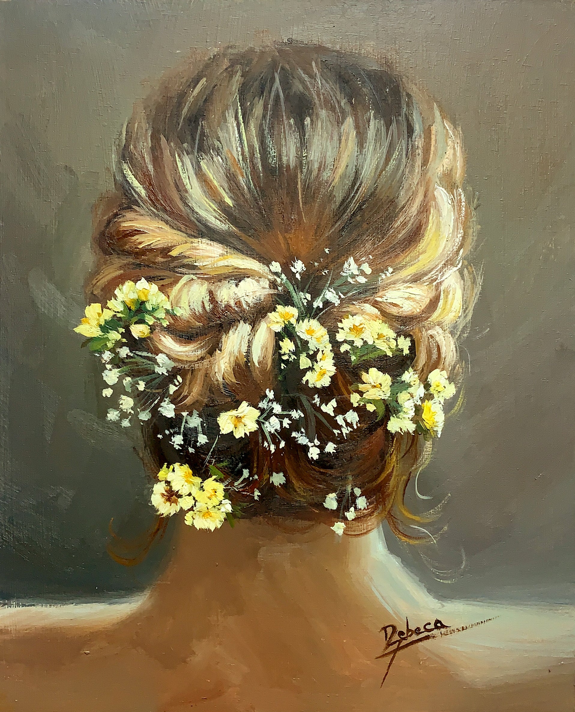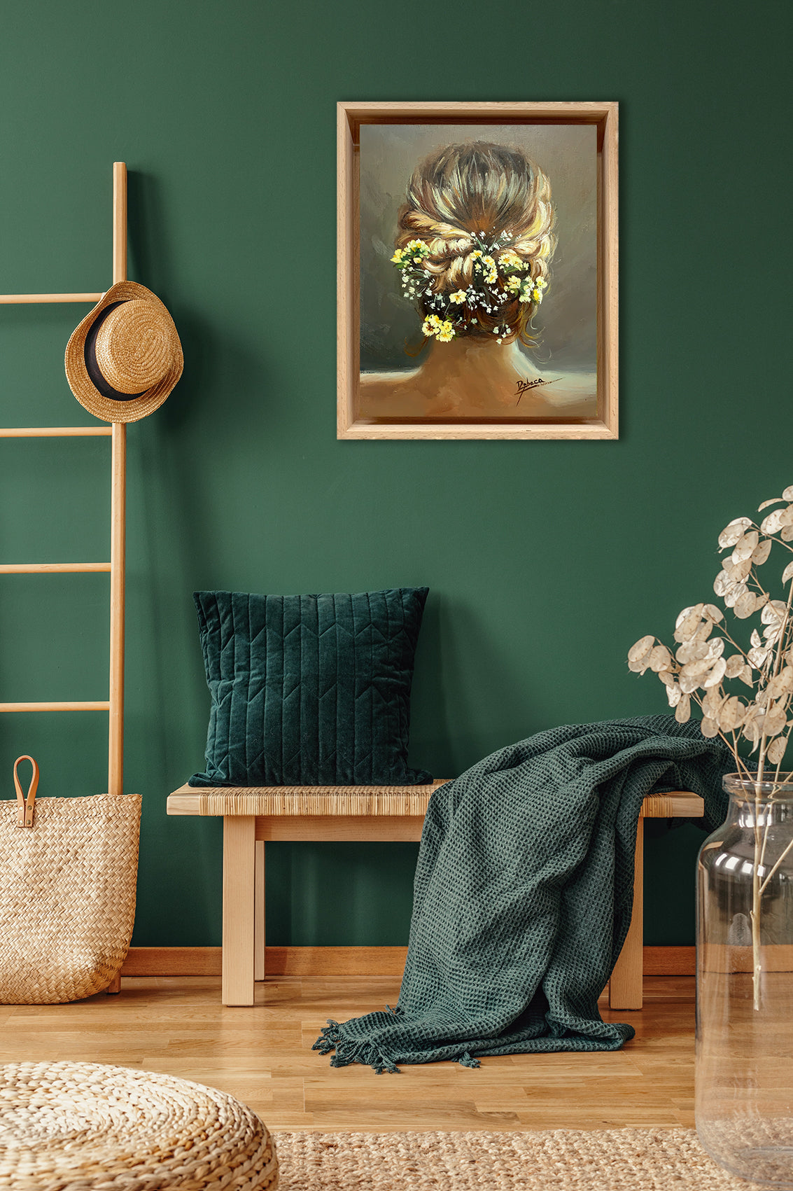 CF21 pertenece a una colección que busca integrar la flor dentro de la figura, formando una serie de peinados femeninos decorados con flores. Esta obra transmite delicadeza, ternura y esperanza, mostrando a una mujer rubia con un recogido romántico adornado con flores silvestres blancas y amarillas. Su presencia emana serenidad y armonía, mientras que el fondo en tonos neutros invita a situarse en cualquier entorno.
