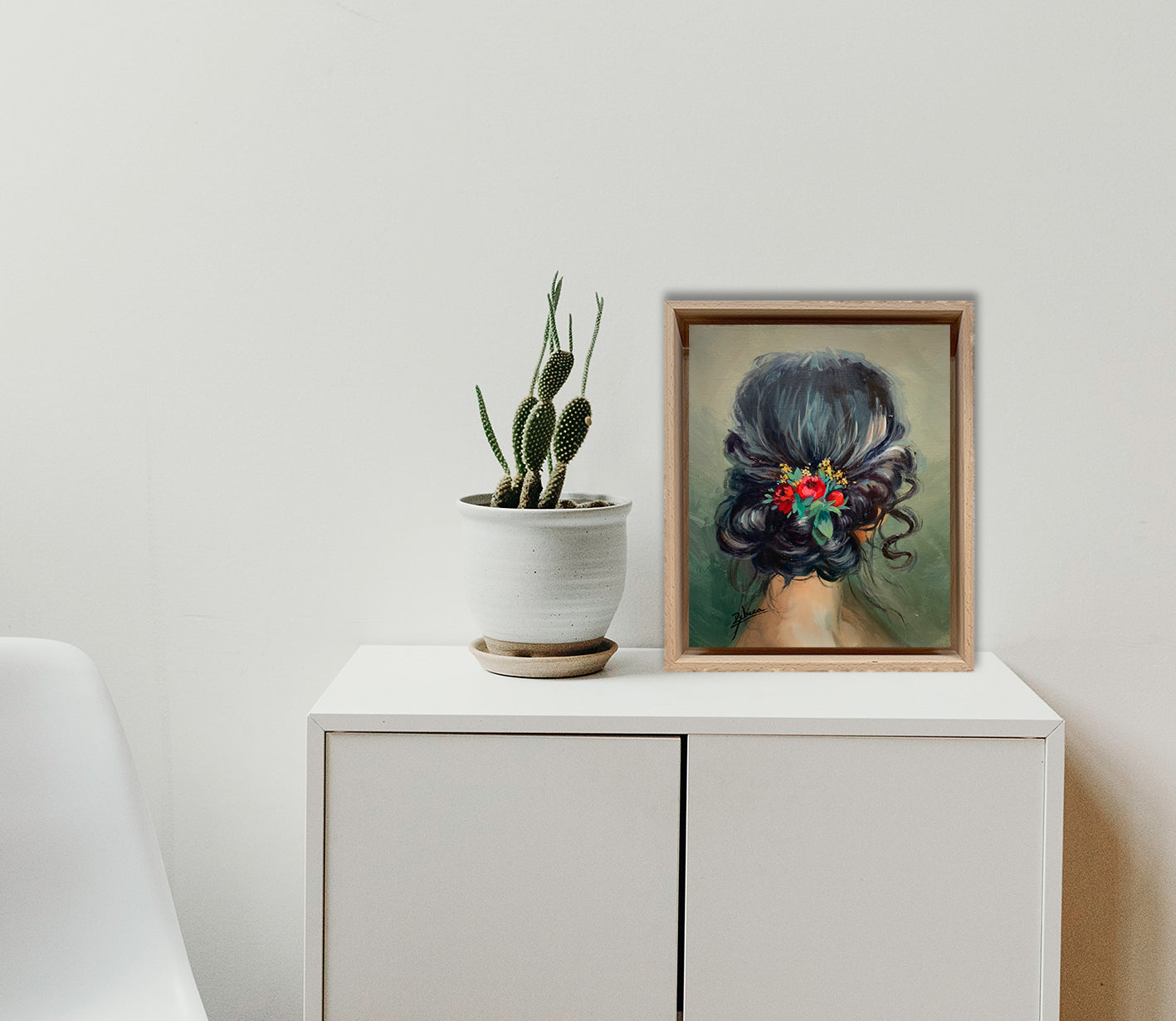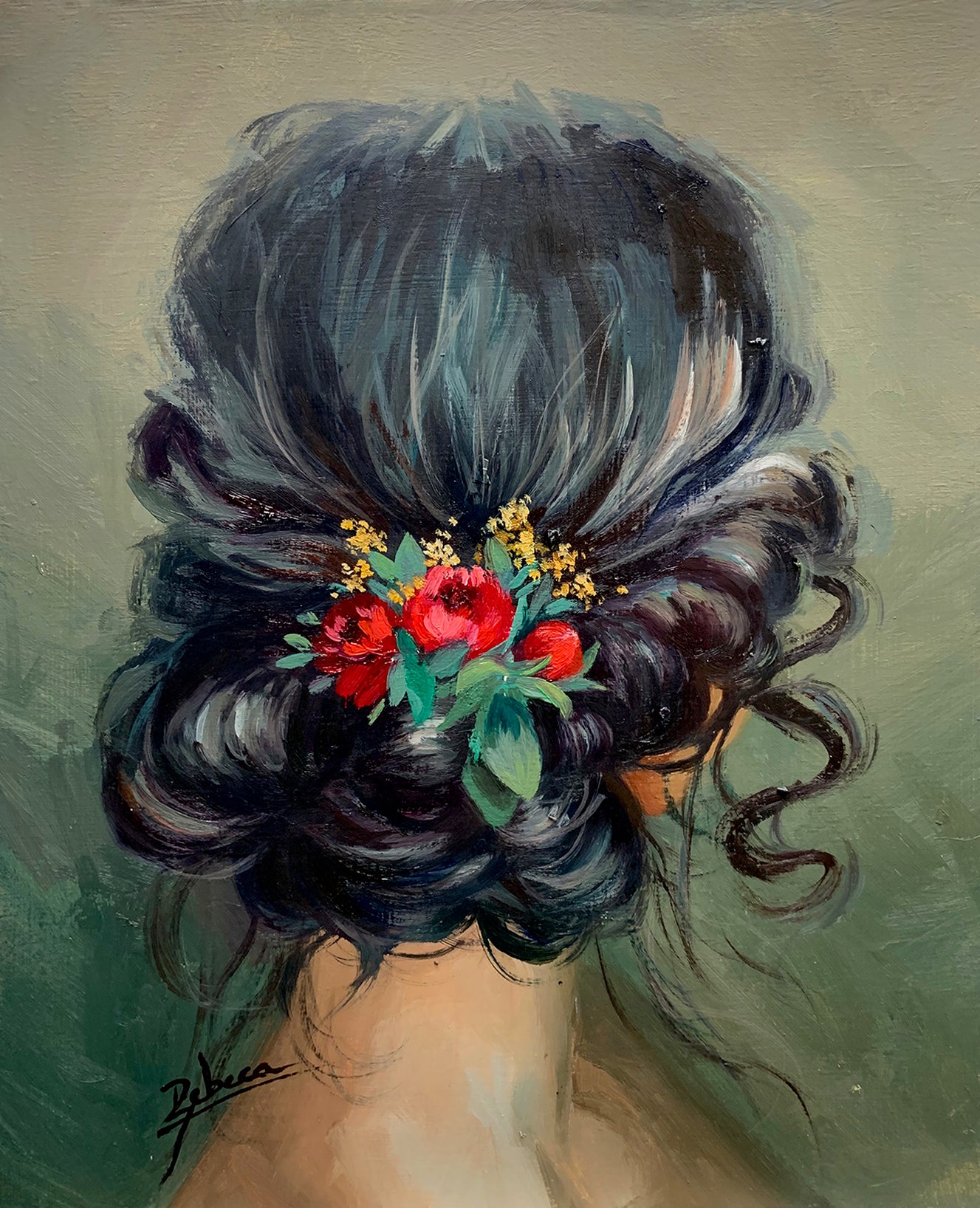 CF22 pertenece a una colección que busca integrar la flor dentro de la figura, formando una serie de peinados femeninos decorados con flores. Esta pieza evoca suavidad, cariño y optimismo, presentando a una mujer morena cuyo perfil revela un recogido informal adornado con flores rojas que resaltan entre su cabello y armonizan con el fondo neutro en tonos grises y verdes. Su figura irradia tranquilidad y equilibrio, mezclando romanticismo con un sutil aire de audacia.