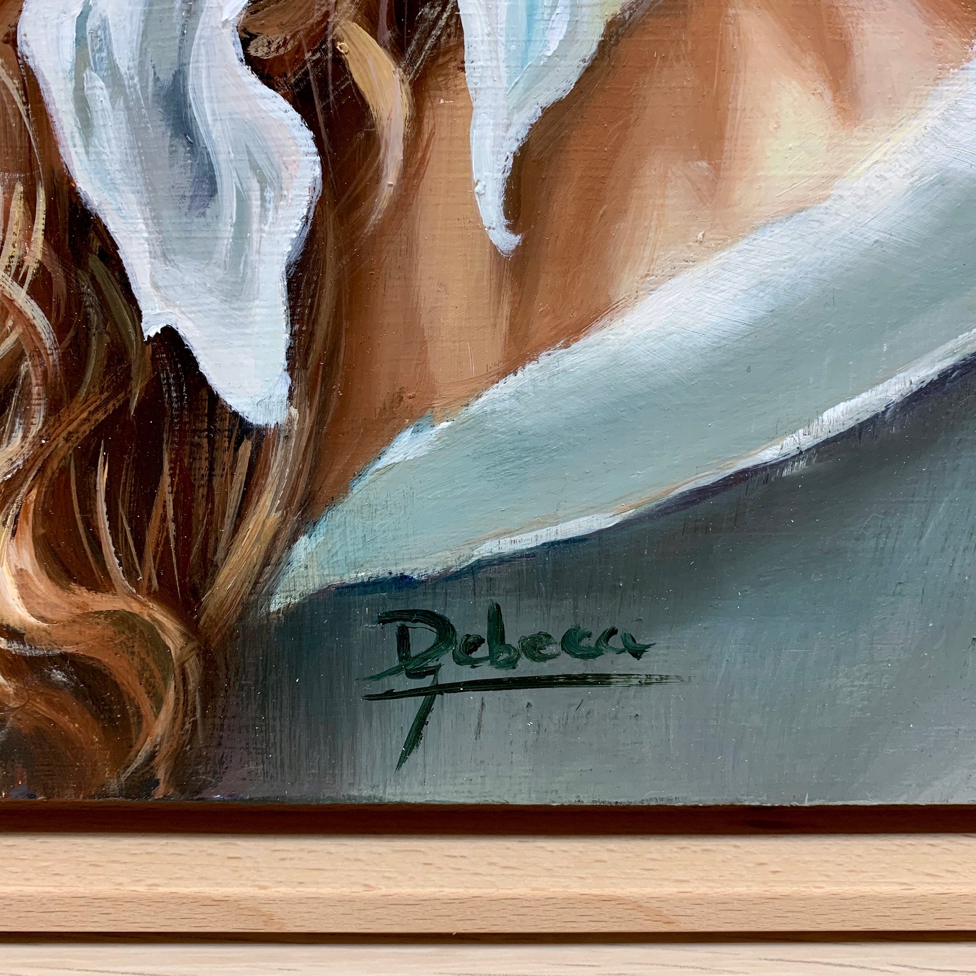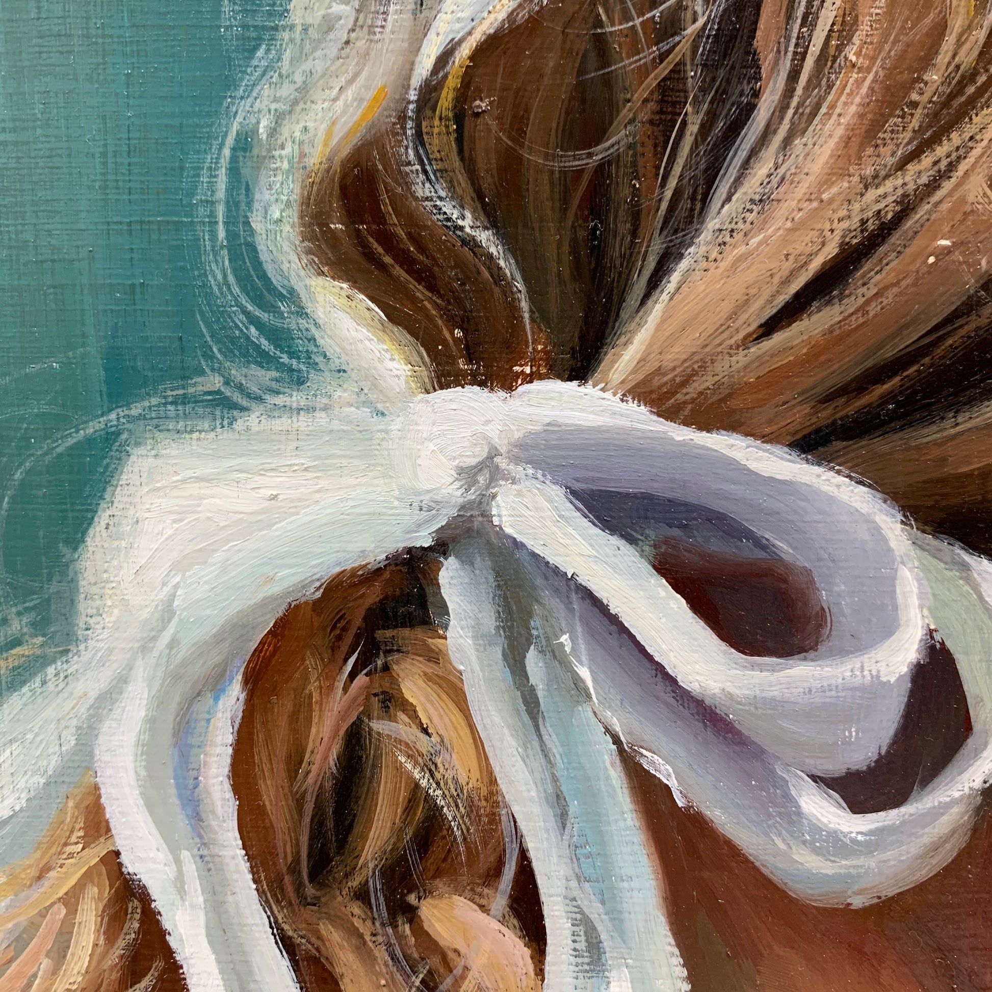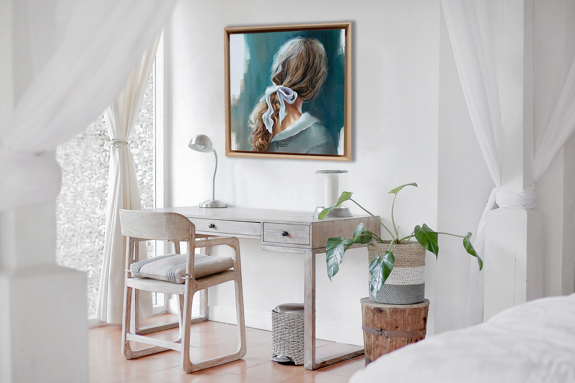CF23 es una pieza figurativa que retrata a una mujer de espaldas con el cabello recogido en un lazo y una coleta ligeramente despeinada. El fondo en tonos azules junto con la sutileza de la técnica nos invita a sumergirnos en sus pensamientos. La armonía de los colores y la composición evocan serenidad, conexión e inspiración.