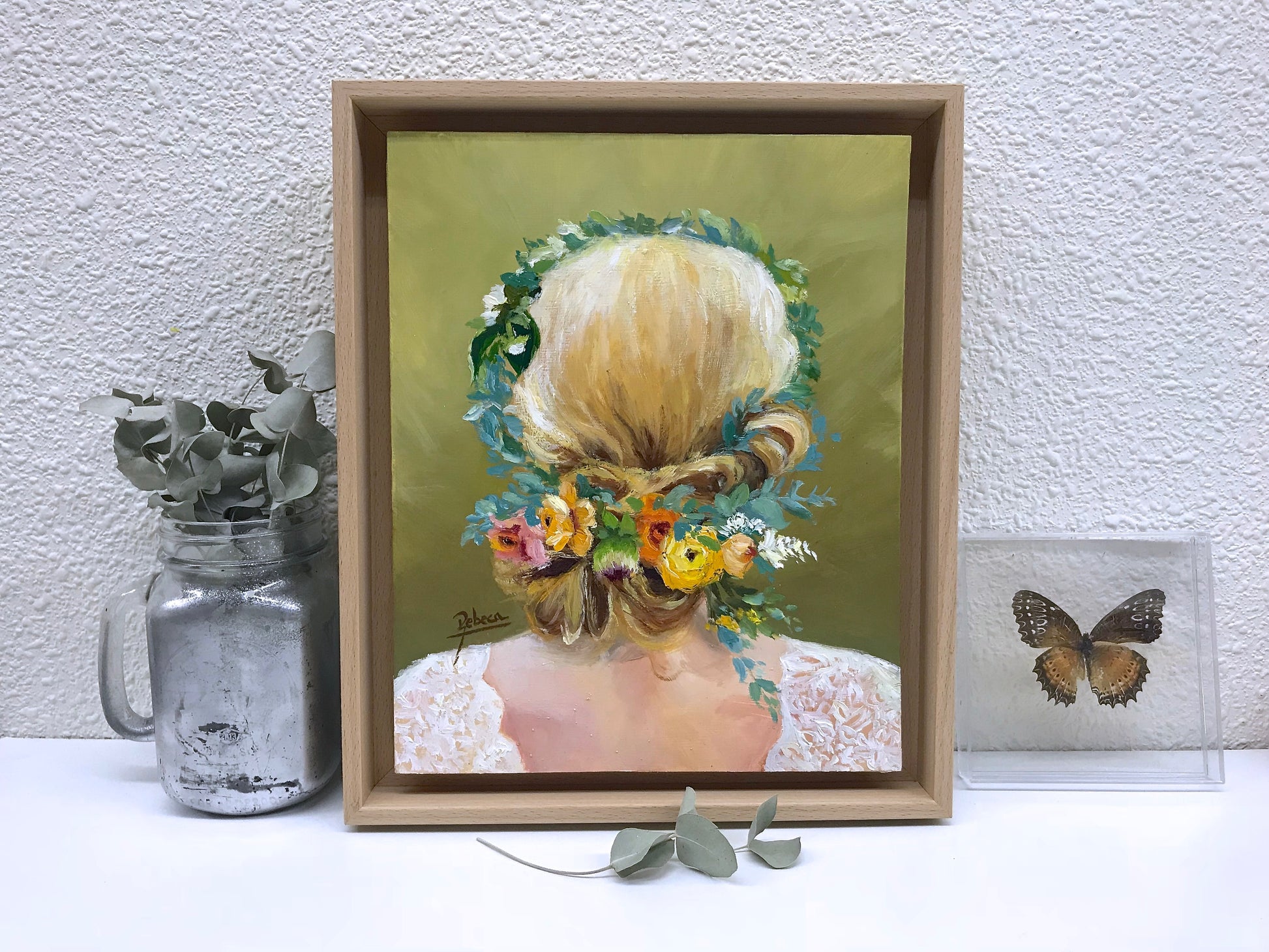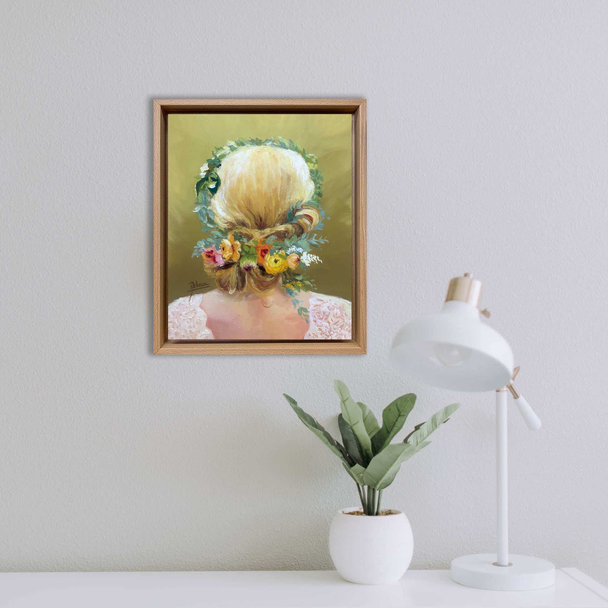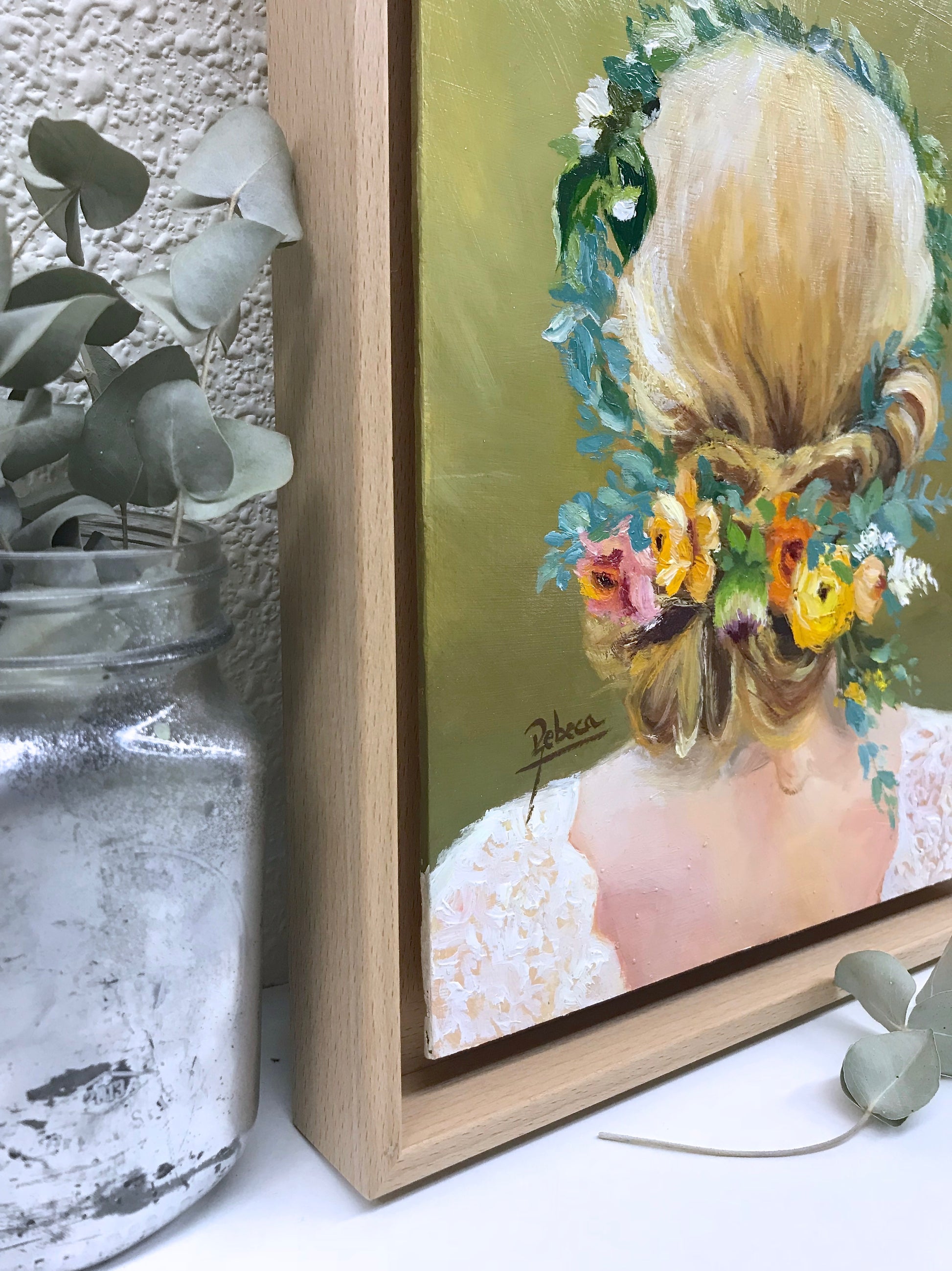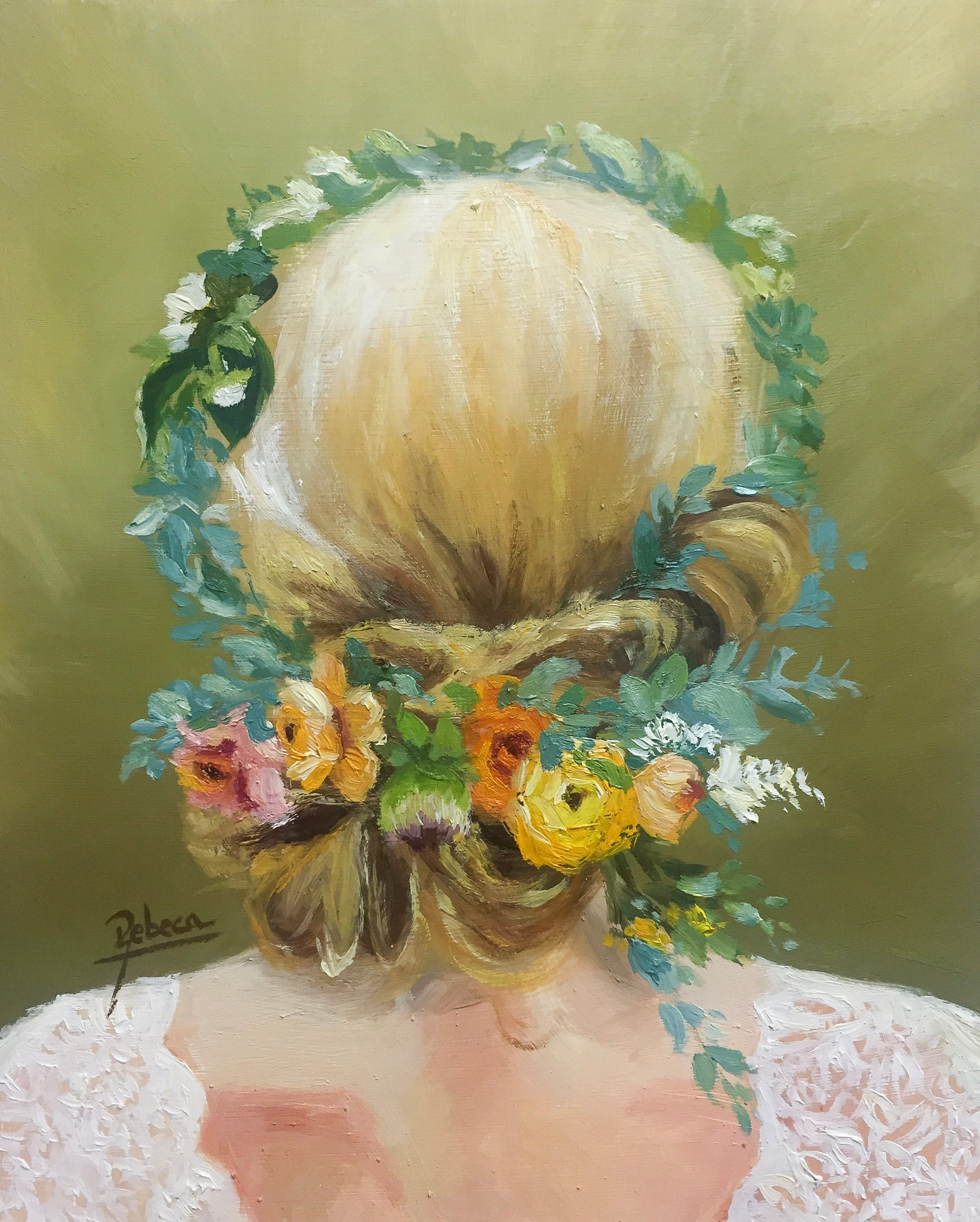 CF9. Este óleo sobre tabla de 27x22 cm presenta una figura femenina de espaldas, con cabello rubio, recogido de forma romántica, adornado con flores y hojas. Pieza única y original, ideal para aportar un toque de romanticismo y delicadeza a cualquier estancia. Perfecta para coleccionistas y amantes de la pintura que buscan obras con carácter y un estilo que invita a la contemplación.