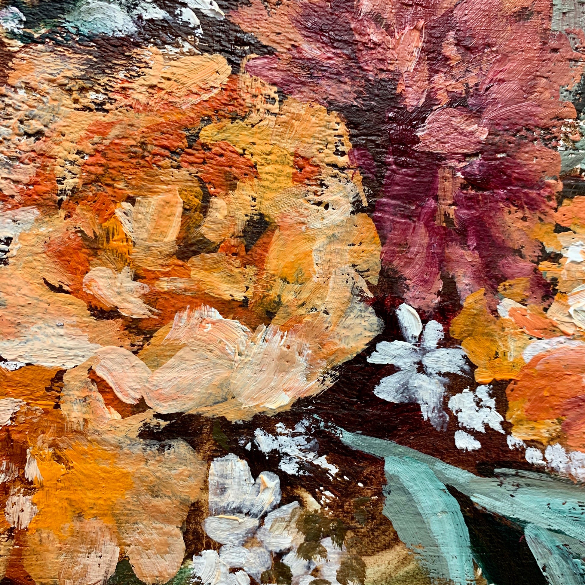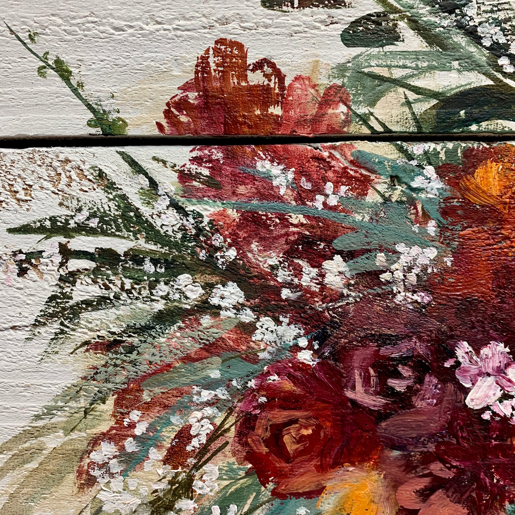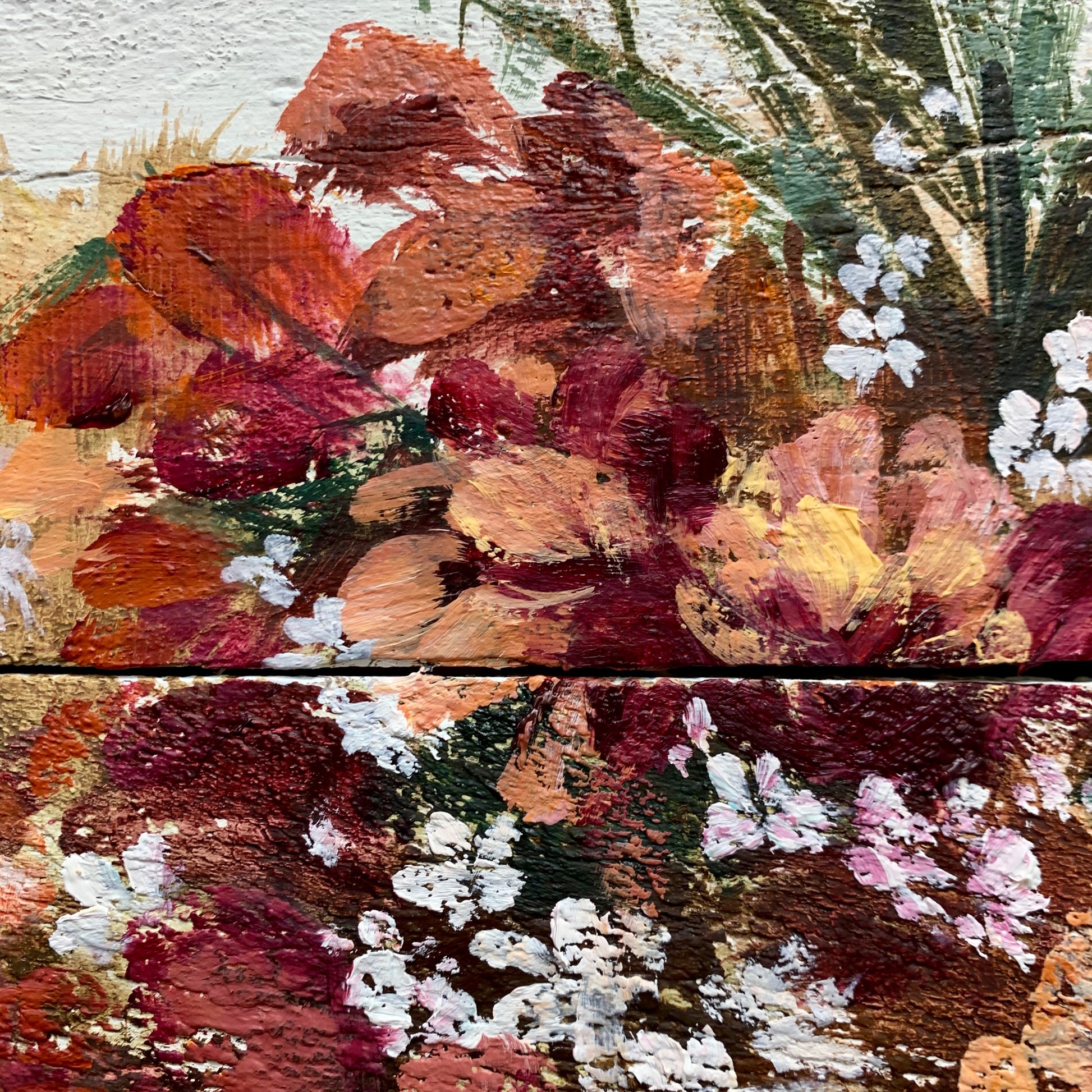 F148, tiene como característica especial su soporte en palé. Con la firme de intención de usar materiales naturales ya usados para otros fines y su reutilización para servir como base artística. Su composición es alegre y vistosa, un grupo de flores en tonos cálidos, haraganas y rosos, combinan con pequeñas en blanco y sus hojas. Dará vitalidad, alegría y optimismo a la estancia en la que se encuentre. Inspira primavera, vitalidad y vida. Ideal para cualquier estancia, para aportar carácter y personalidad.