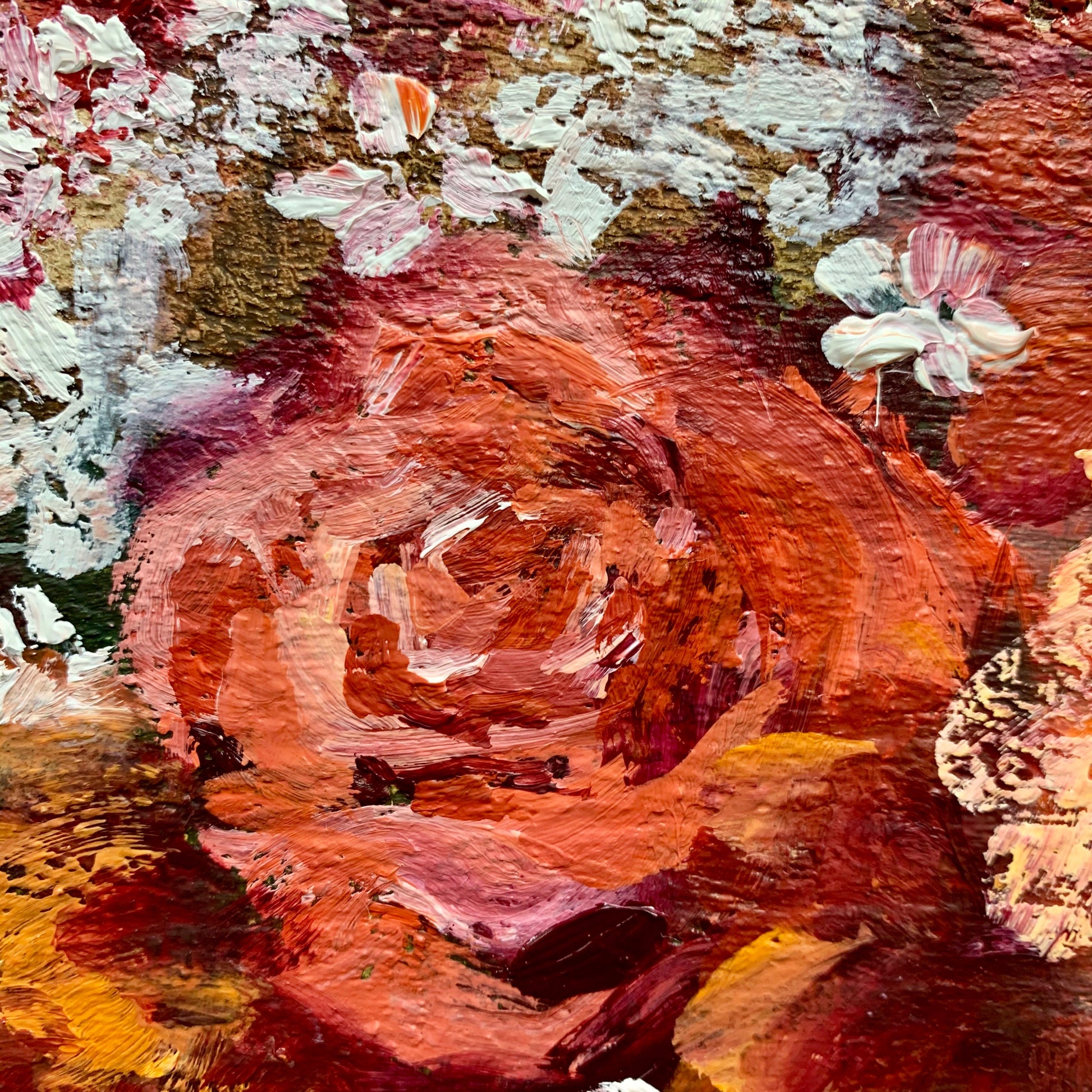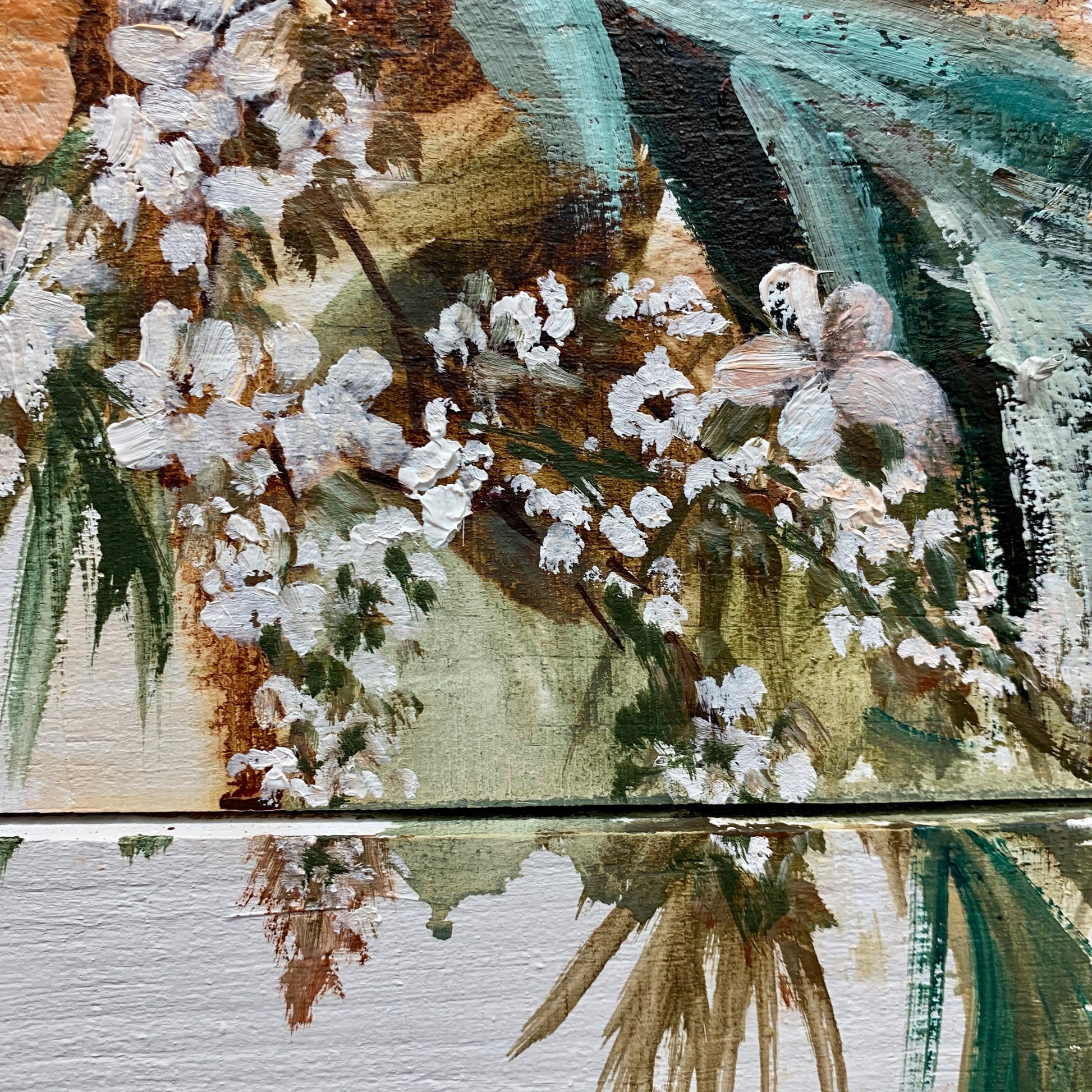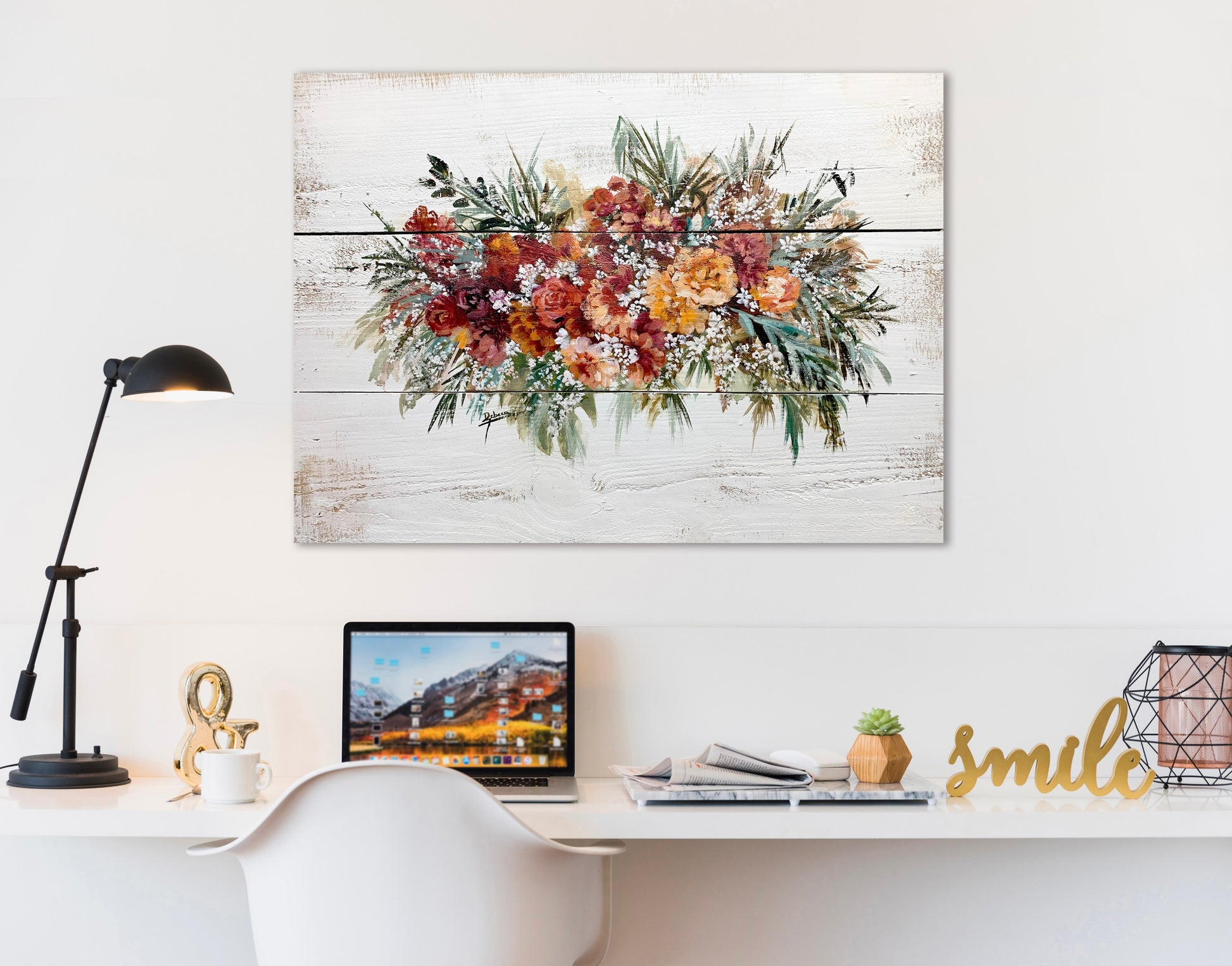 F148, tiene como característica especial su soporte en palé. Con la firme de intención de usar materiales naturales ya usados para otros fines y su reutilización para servir como base artística. Su composición es alegre y vistosa, un grupo de flores en tonos cálidos, haraganas y rosos, combinan con pequeñas en blanco y sus hojas. Dará vitalidad, alegría y optimismo a la estancia en la que se encuentre. Inspira primavera, vitalidad y vida. Ideal para cualquier estancia, para aportar carácter y personalidad.