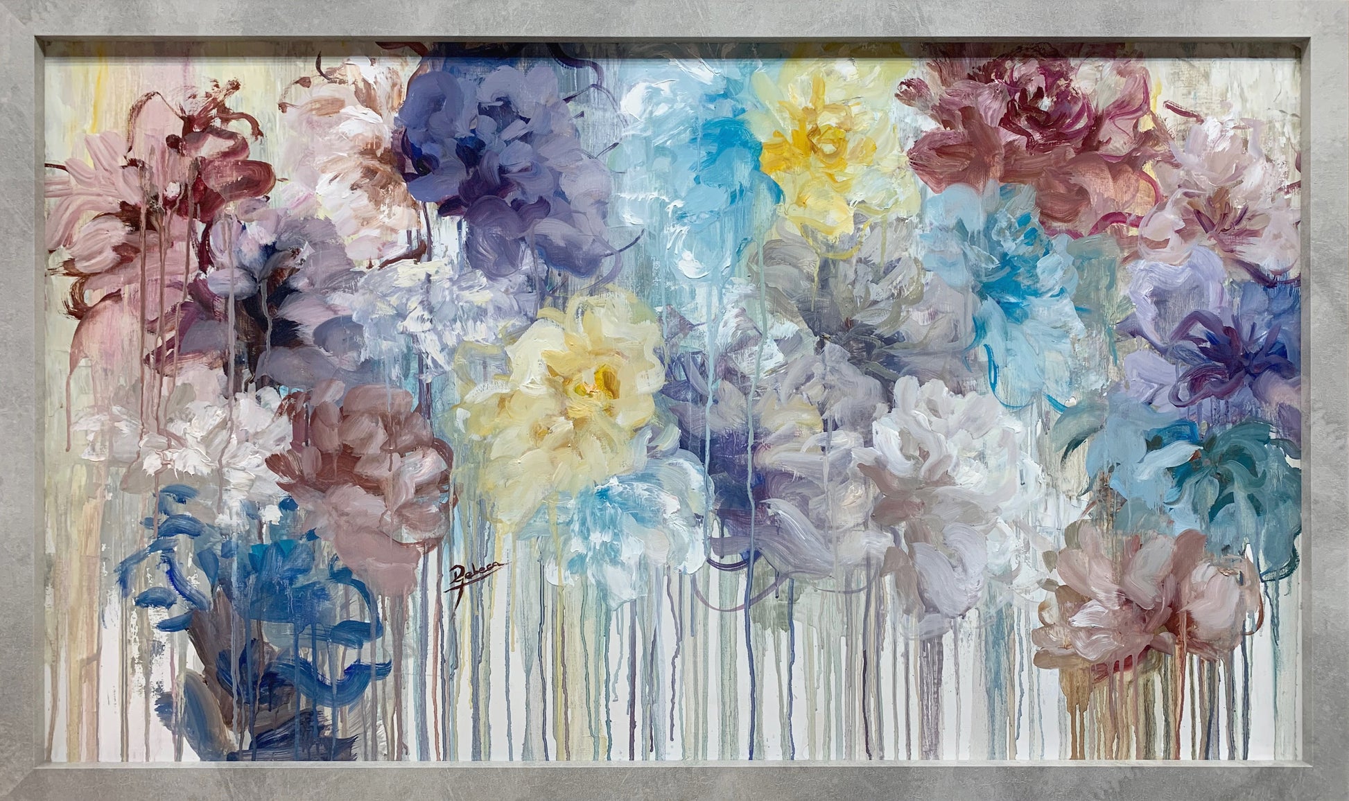 F155, representa un conjunto floral desdibujado en tonos empolvados y alegres, recrea un estado de ensueño donde las flores parecen levitar como nubes, invita a la imaginación y si composición abierta, deja espacio para la interpretación y la fantasía.
