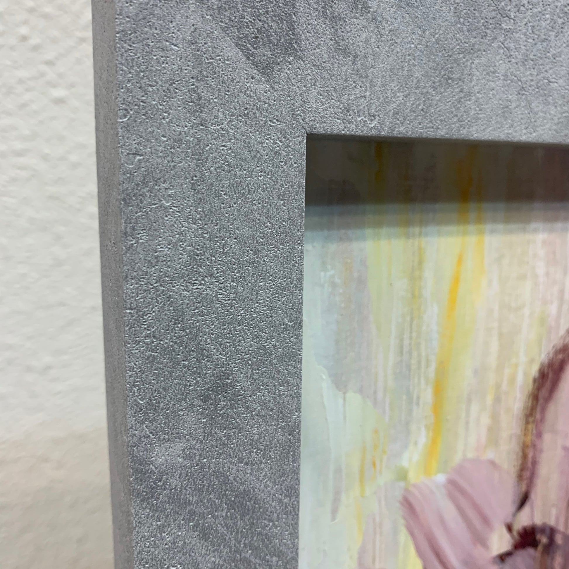 Marco: Enmarcado con escuadra de madera con revestimiento gris, efecto granito.