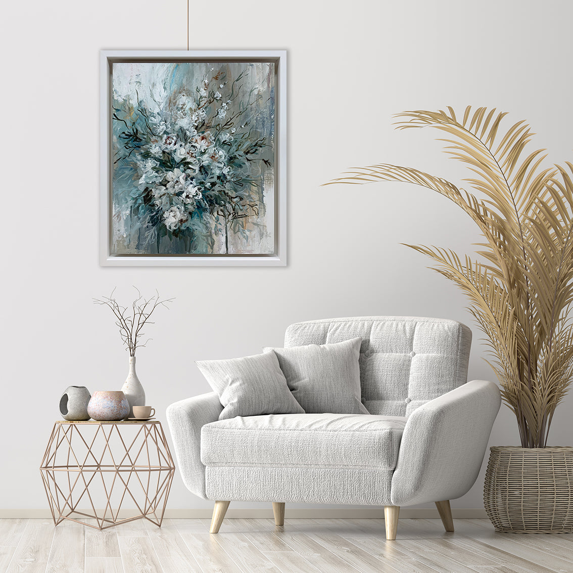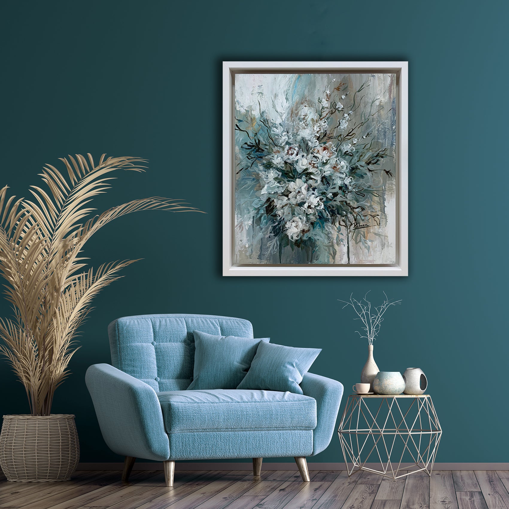 F168, es una composición que respira fantasía, donde las flores emergen del diálogo entre materia y trazo, conformando un ramo etéreo suspendido en un universo abstracto y envolvente. Los tonos azules, terrosos y blancos crean una atmósfera de levitación visual, mientras el azul predominante infunde un carácter mágico que transmite calma y serenidad. Esta obra de dimensiones medias se adapta con elegancia a cualquier espacio, desde paredes íntimas hasta rincones que requieren un toque de sofisticación. Su marco minimalista cierra la composición con discreción, permitiendo que la obra dialogue naturalmente con su entorno.