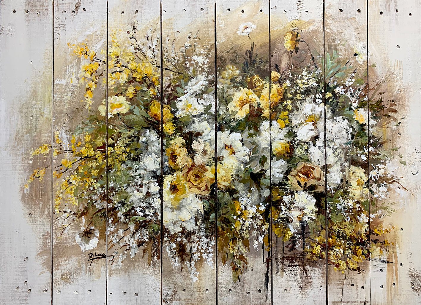 F169, tiene como característica especial su soporte en palé. Con la firme de intención de usar materiales naturales ya usados para otros fines y su reutilización para servir como base artística. Su composición, en tonos amarillos y cálidos, le darán vitalidad, alegría y optimismo a la estancia en la que se encuentre. Inspira primavera, vitalidad y vida. Ideal para cualquier estancia, para aportar carácter y personalidad.
