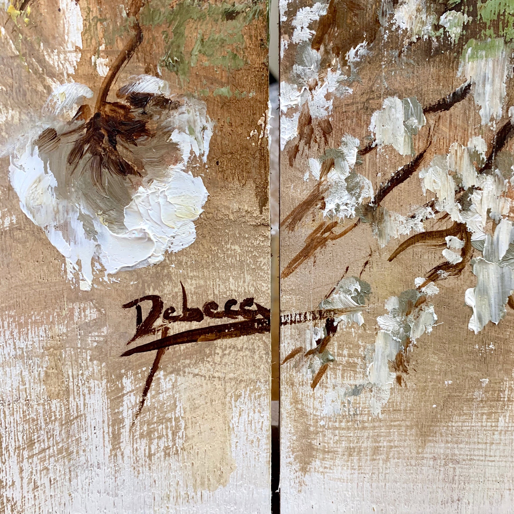Tips: Por la condición especial del material usado como soporte, es ideal para dar un toque rural y despreocupado al lugar donde será expuesto. Madera natural reutilizada como base de una creación pictórica.