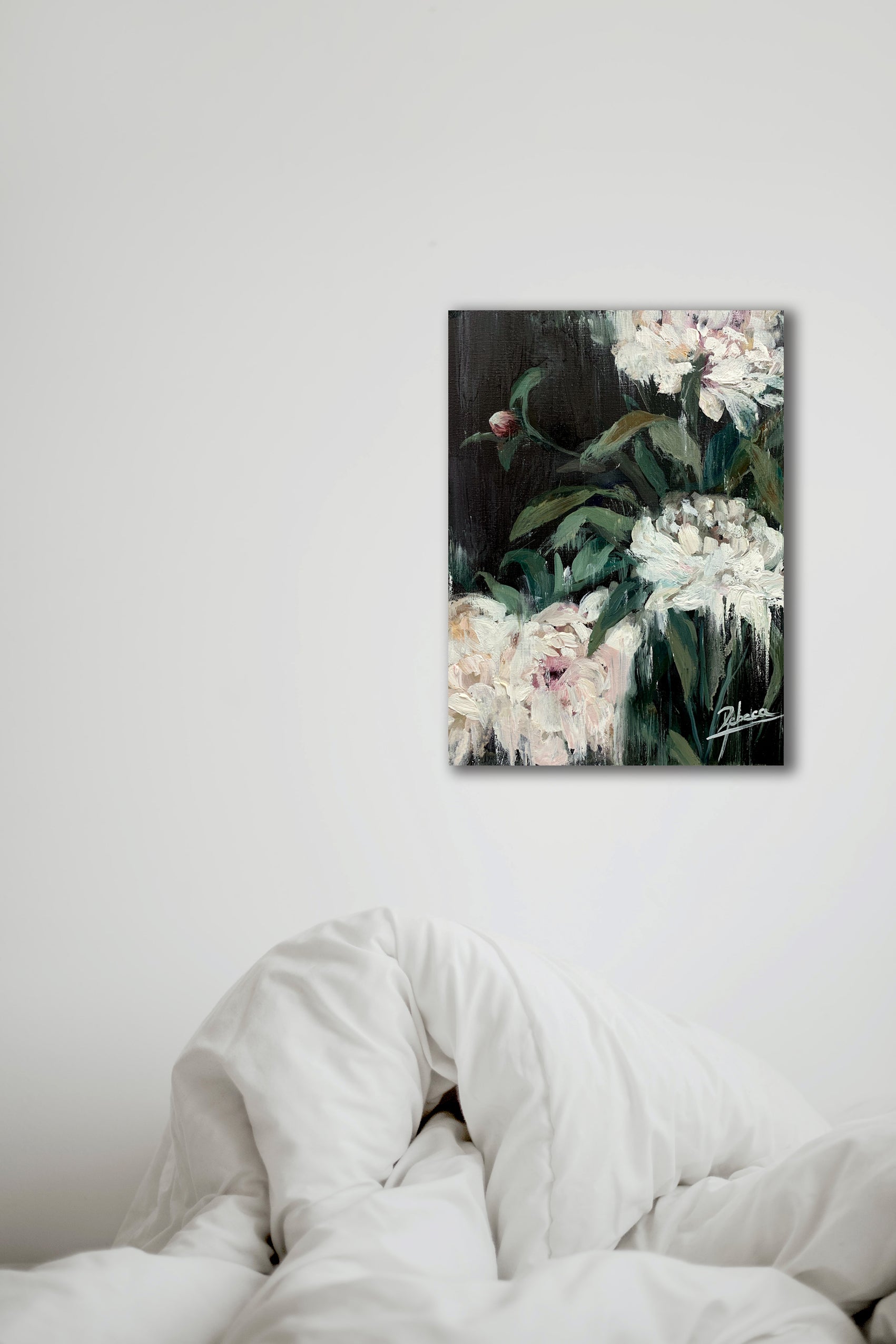 F182, Esta obra presenta un delicado conjunto de peonías en tonos blancos y rosados que emergen de un fondo sombrío. La técnica pictórica, caracterizada por trazos gestualistas y un efecto de difuminado, confiere una cualidad abstracta a la composición sin perder su legibilidad figurativa. El diálogo entre la oscuridad del fondo y la luminosidad floral se equilibra mediante el movimiento orgánico del follaje, creando una armonía visual sofisticada. Su formato reducido lo convierte en una pieza versátil, perfecta para enriquecer cualquier espacio, superficie o rincón con elegancia.
