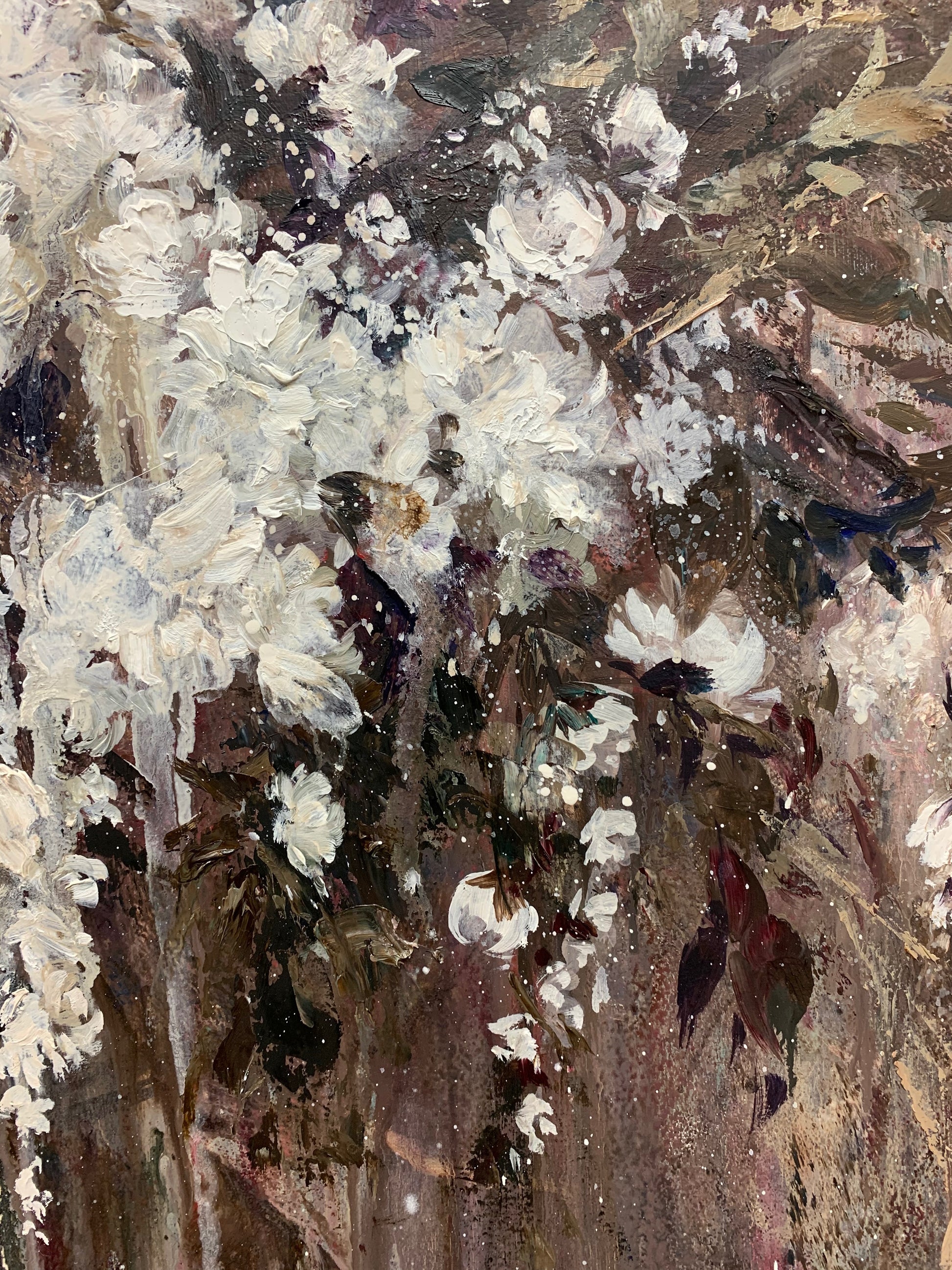 F185, F185 captura la esencia de la naturaleza. Esta composición presenta una delicada flor blanca que emerge con protagonismo absoluto, rodeada de una hojarasca etérea en tonos tierra y granate que se desvanecen gradualmente hacia un fondo abstracto envolvente. La paleta cromática —tierra, burdeos y blanco— crea una tensión visual sofisticada entre la delicadeza y la intensidad. Evocando un otoño perpetuo, romántico y atemporal que trasciende las estaciones. Esta pieza es tanto una meditación visual como una declaración artística, perfecta para espacios que demandan profundidad emocional y refinamiento estético. Una obra que invita a la contemplación y enriquece cualquier colección de arte contemporáneo.