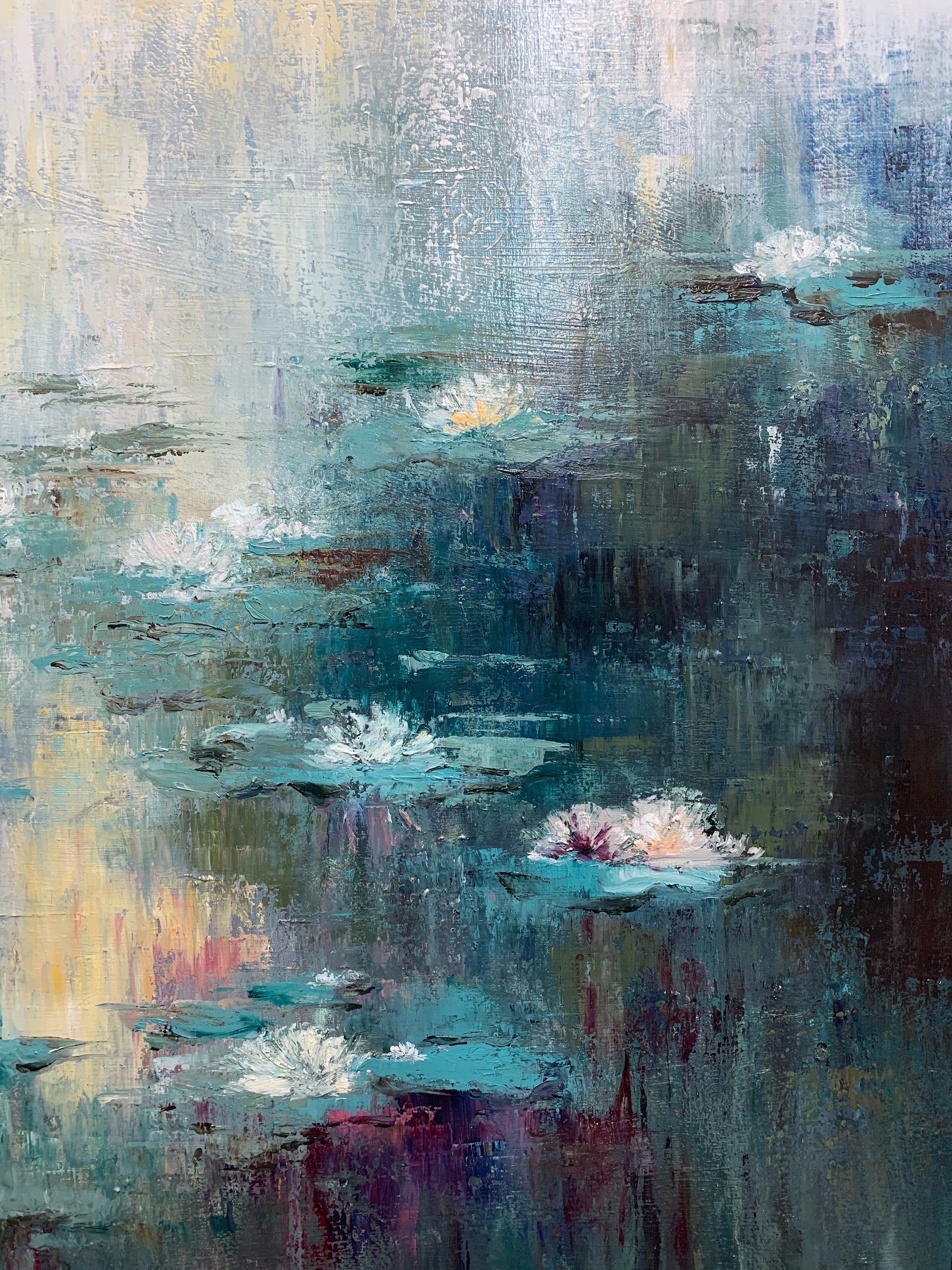 F187, delicada escena de nenúfares sobre el agua. Su fondo casi abstracto sirve como base de un agua con reflejos en tonos tanto claros como oscuros, con una paleta de color variada, pero donde predomina el verde, los nenúfares se muestra libres descansando sobre sus hojas. Es una composición elegante, romántica y que nos traslada a un lugar ideal de paz, tranquilidad donde casi el agua se puede escuchar. Esta pieza dará sensibilidad, status, exclusividad y belleza estética a la estancia.