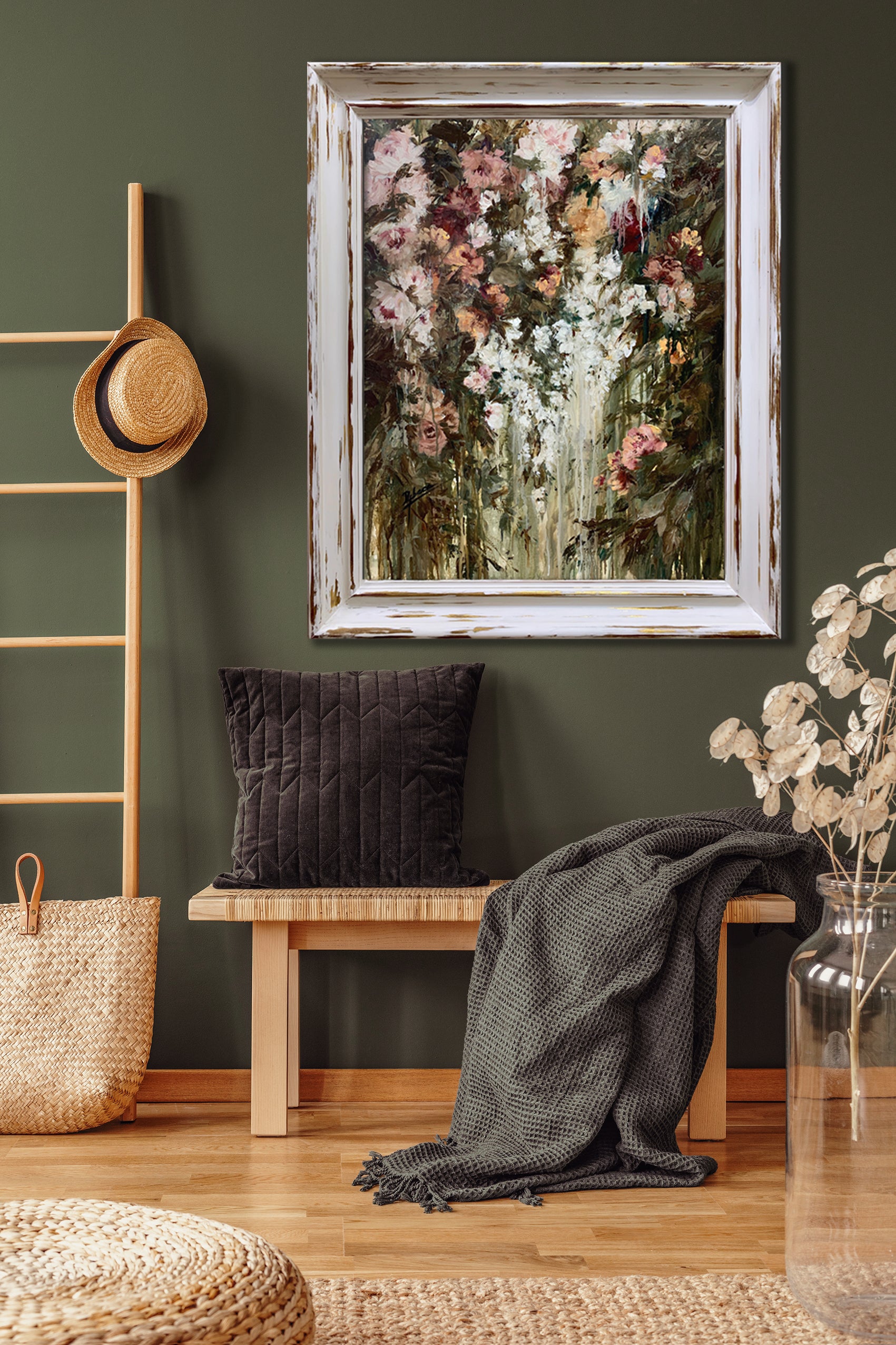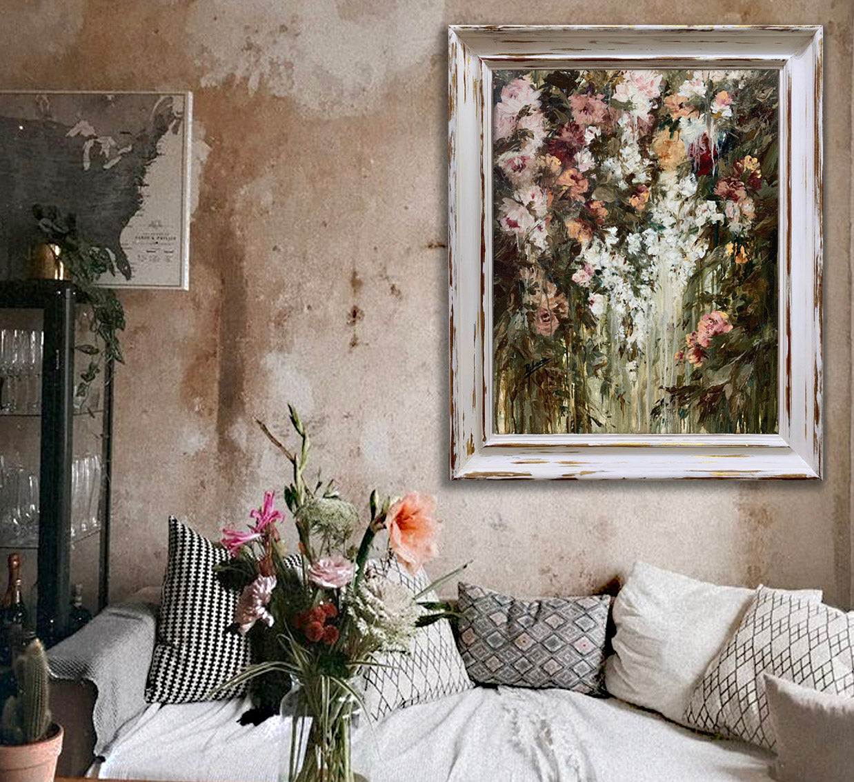 F188, delicada escena que parece simular un arco de flores que caen con gracia capturando la fusión entre lo salvaje y lo delicado. A través de densas pinceladas, otras con efecto goteo y una paleta rica en verdes musgo, blancos cremosos y acentos en rosas y corales, sumerge al espectador en un jardín secreto donde las flores brotan con libertad entre sombras y luz. Las flores se funden con el entorno, en un juego casi místico entre lo real y lo onírico, lo visible y lo sugerido.