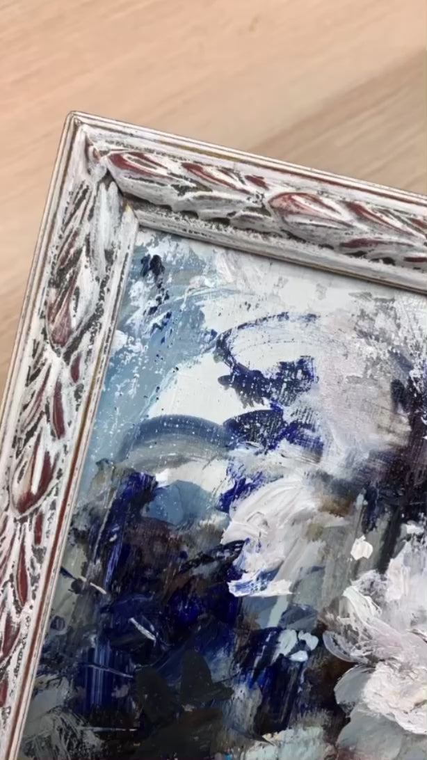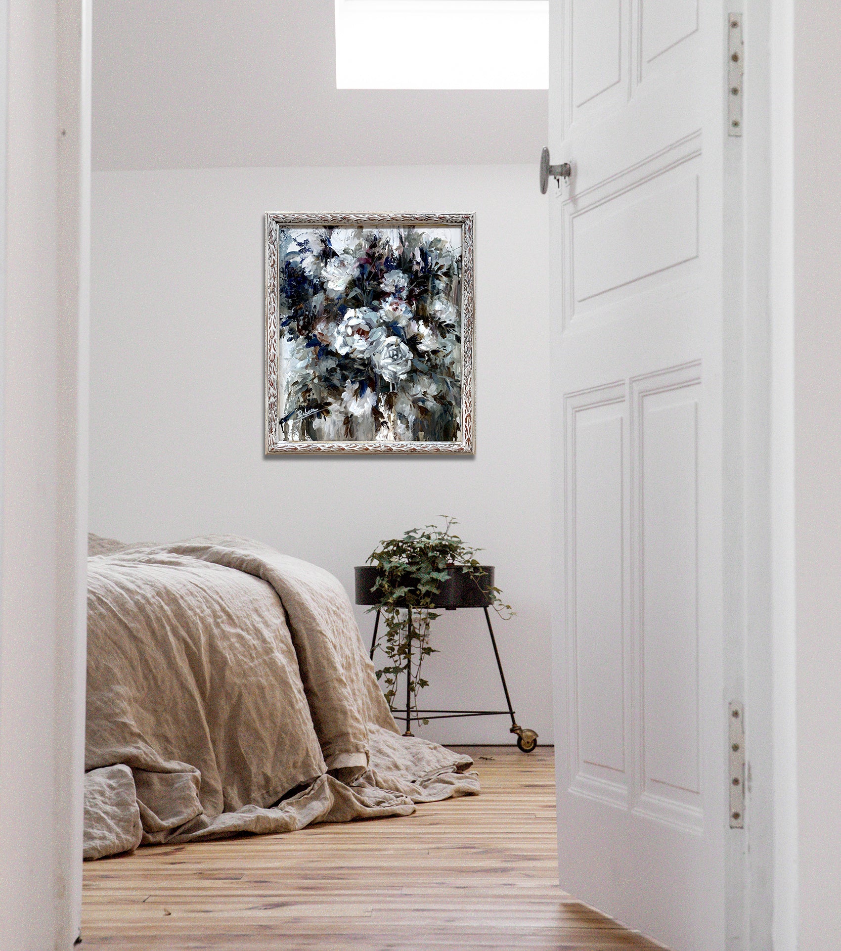F195, es delicada rosaleda, compuesta por rosas blancas impresionistas y su follaje en tonos azules y marrones. Con contraste entre luces y sombras, se puede observar la profundidad de capas de la obra. Impresionismo hecho rosaleda. Sus colores en tonos fríos y azules, dará calma y tranquilidad al observador. Por su tamaño mediano es ideal para cualquier espacio.