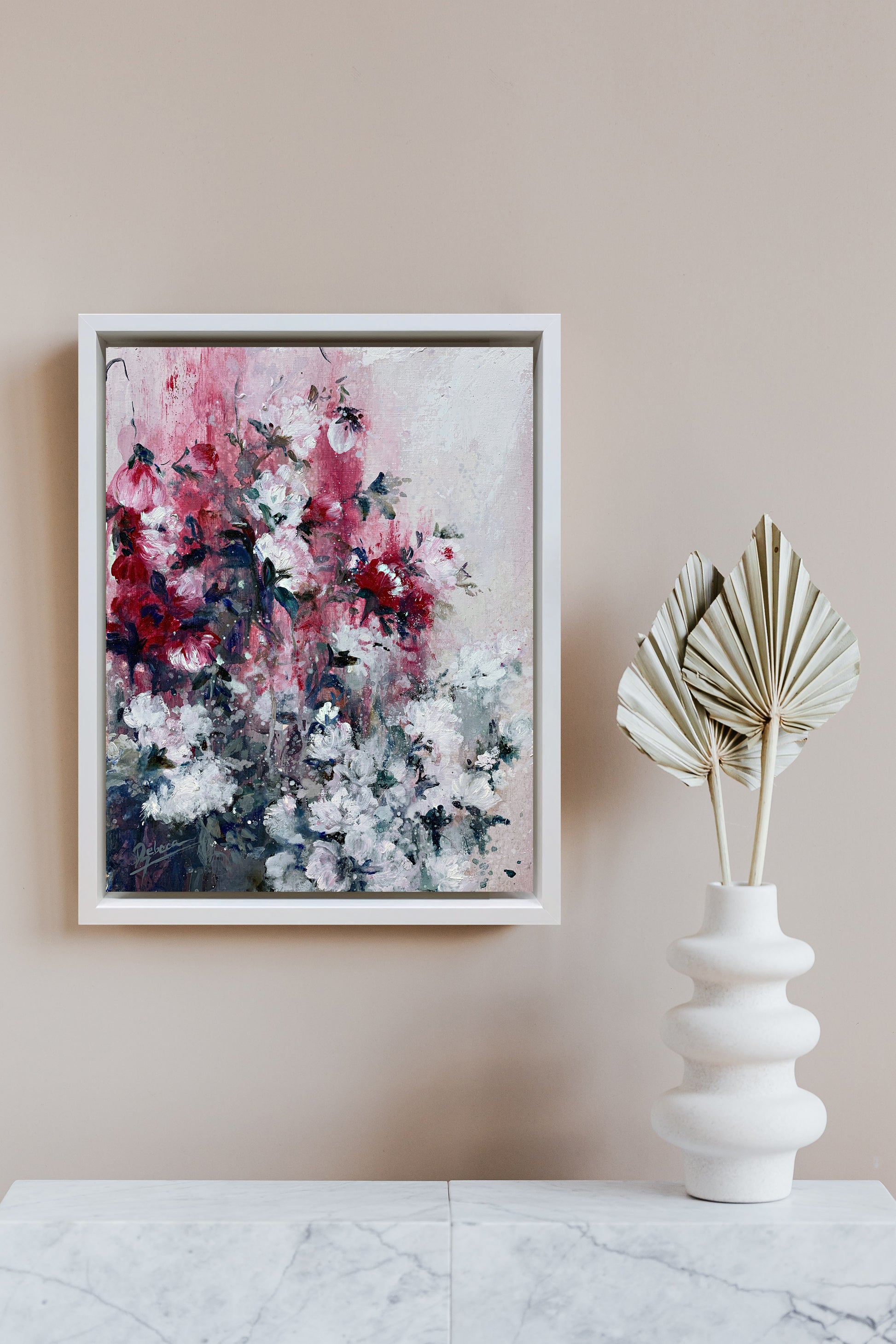 F205, flores agrupadas en un aparente caos ordenado. El uso denso de pintura y técnicas como el goteo o salpicado le aportan profundidad visual. Sus colores como el rojo y rosa evocan sentimientos de pasión, amor y energía. Los tonos blancos y fríos balancean la intensidad, generando calma. Ideal para interiores modernos o eclécticos, pues aporta sofisticación, frescura y dinamismo. Las flores evocan vida, crecimiento y renovación. Puede generar una sensación de conexión con lo orgánico y lo natural, incluso en espacios urbanos. Cada pieza es única, por lo que esto le otorga autenticidad y valor a cualquier estancia donde quiera que sea expuesta.