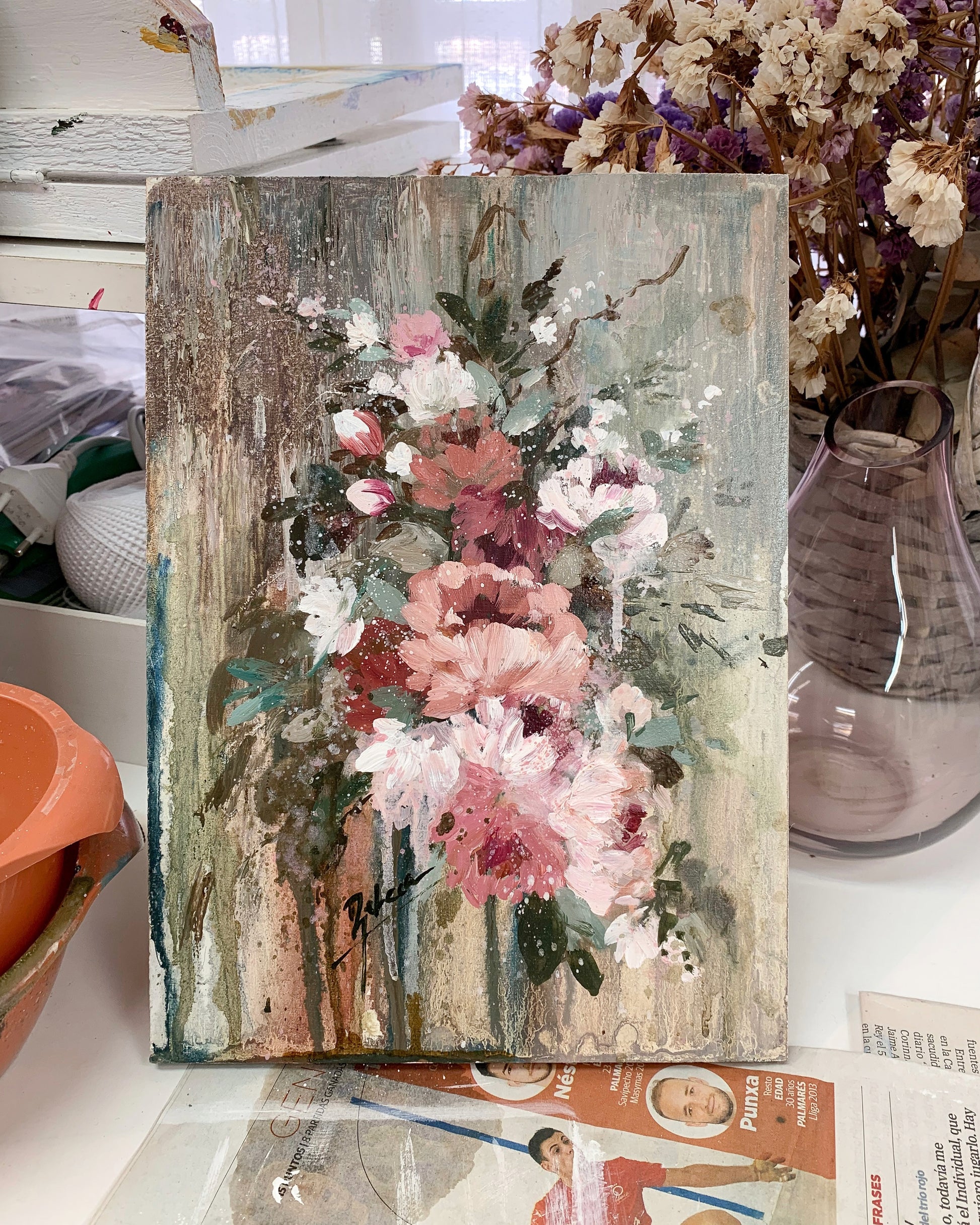 F209 es una obra mini que representa un ramo o bouquet en tonos verde, marrón y rosa. Combina un fondo abstracto con la composición floral. Su tamaño pequeño y sus colores naturales, lo hacen ideal para cualquier espacio. Dan serenidad, conectan con lo natural y reflejan la fugacidad de un momento en flor. Captura el instante.