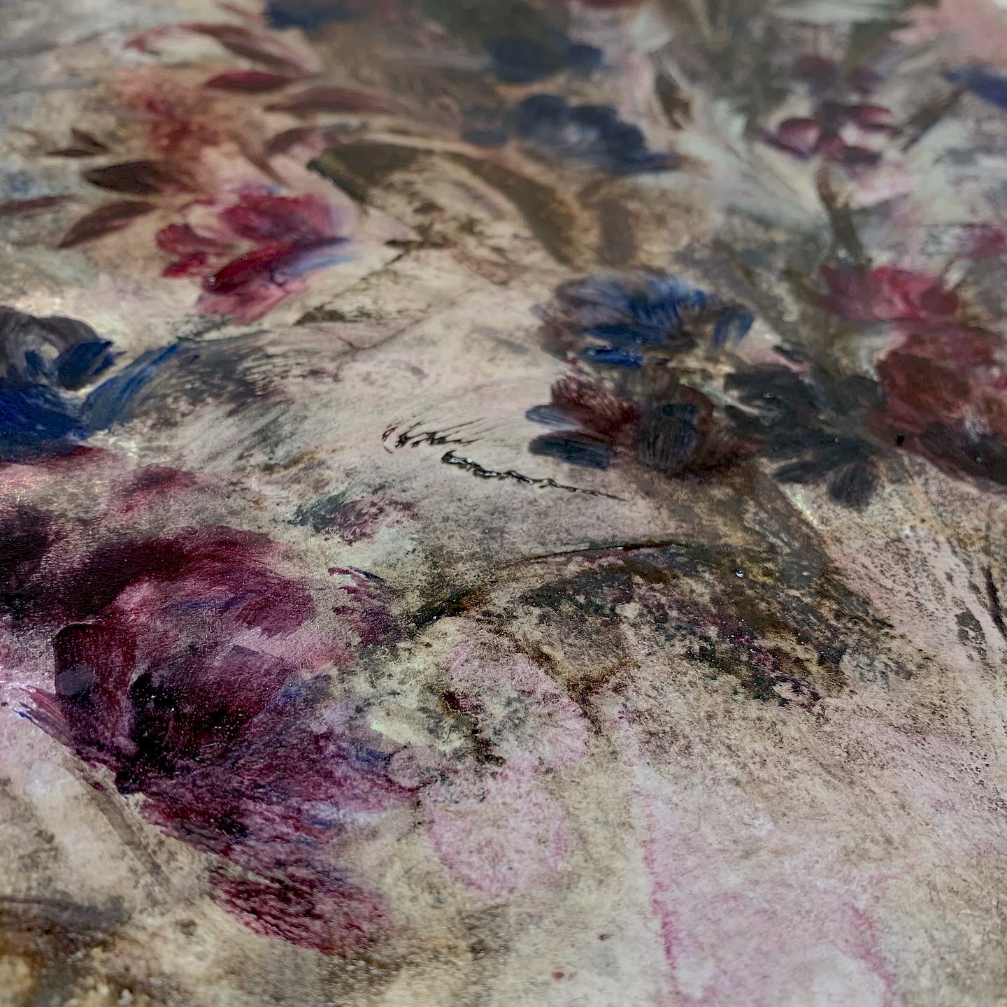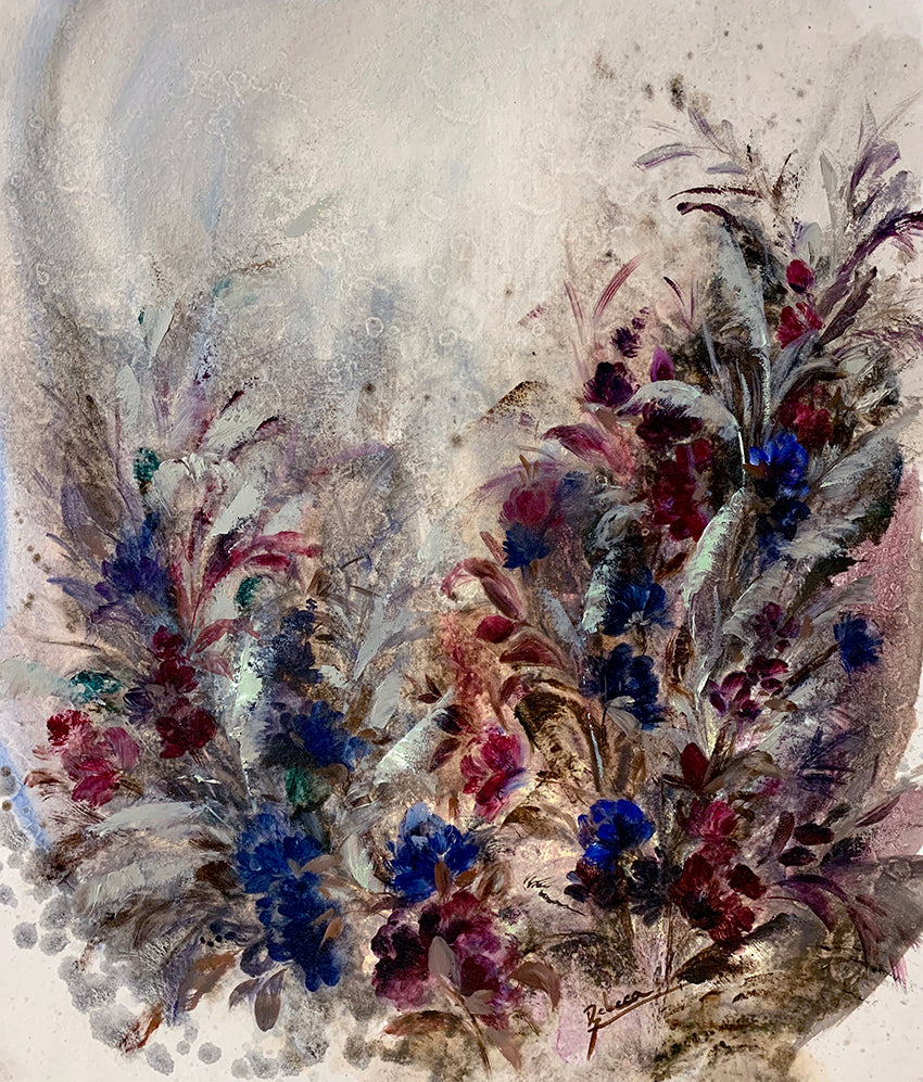 F220, es una obra compuesta de forma inversa a las demás, es original por representar las flores en los tonos más oscuros y poner en contraste la luz, en el fondo y en las hojas que complementan la composición. Las flores oscuras le dan cierto aire de misterio, madurez, poder y fuerza. El fondo desgastado y oxidado, nos recuerda la fugacidad del momento, de esas flores que en poco morirán, pero que por el momento han sido capturas. La hojarasca baila a su alrededor, la envuelve y la acompaña. Se notan en la composición elementos como el goteo en el fondo, la espátula en las hojas y el pincel en las flores.