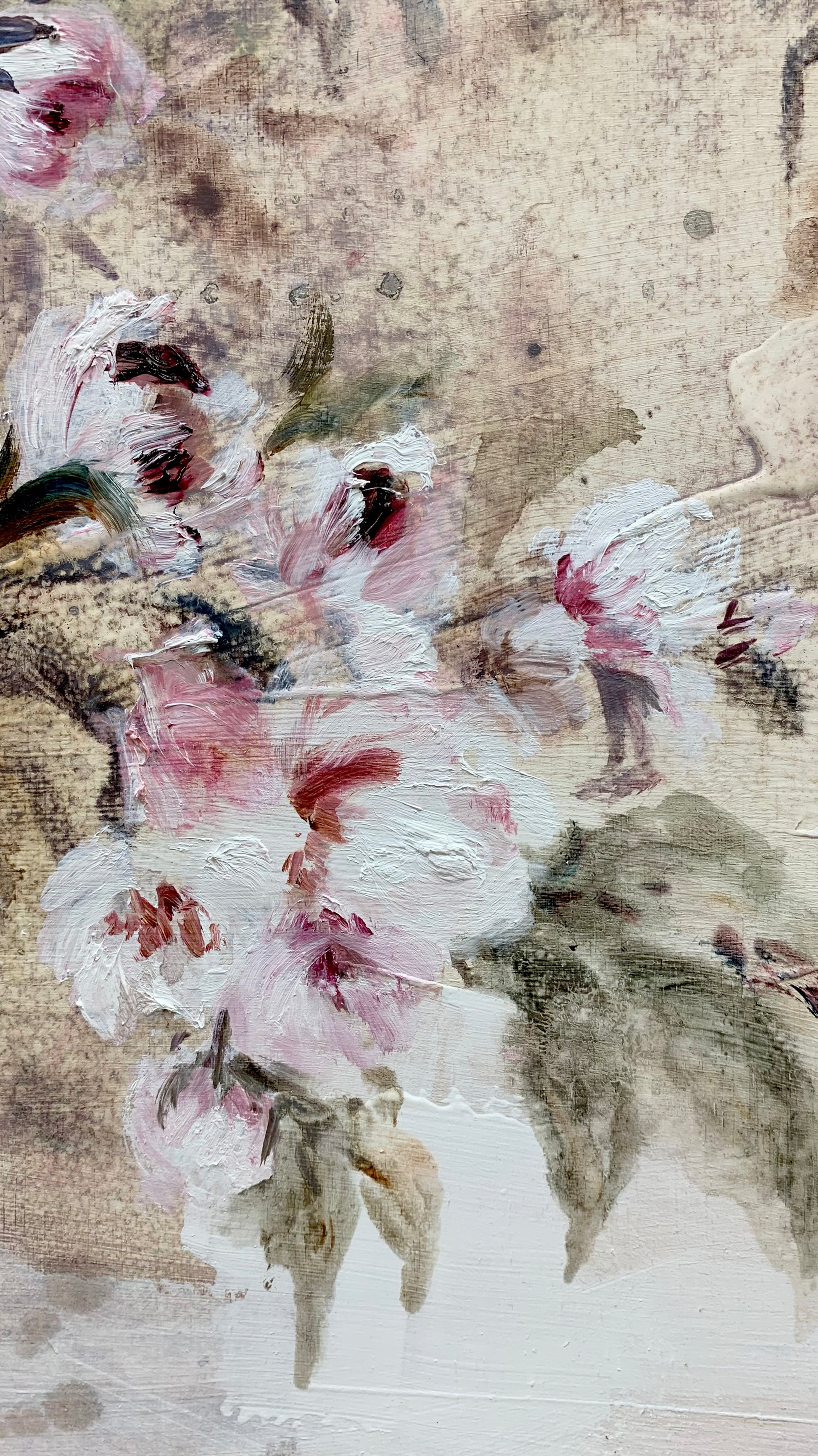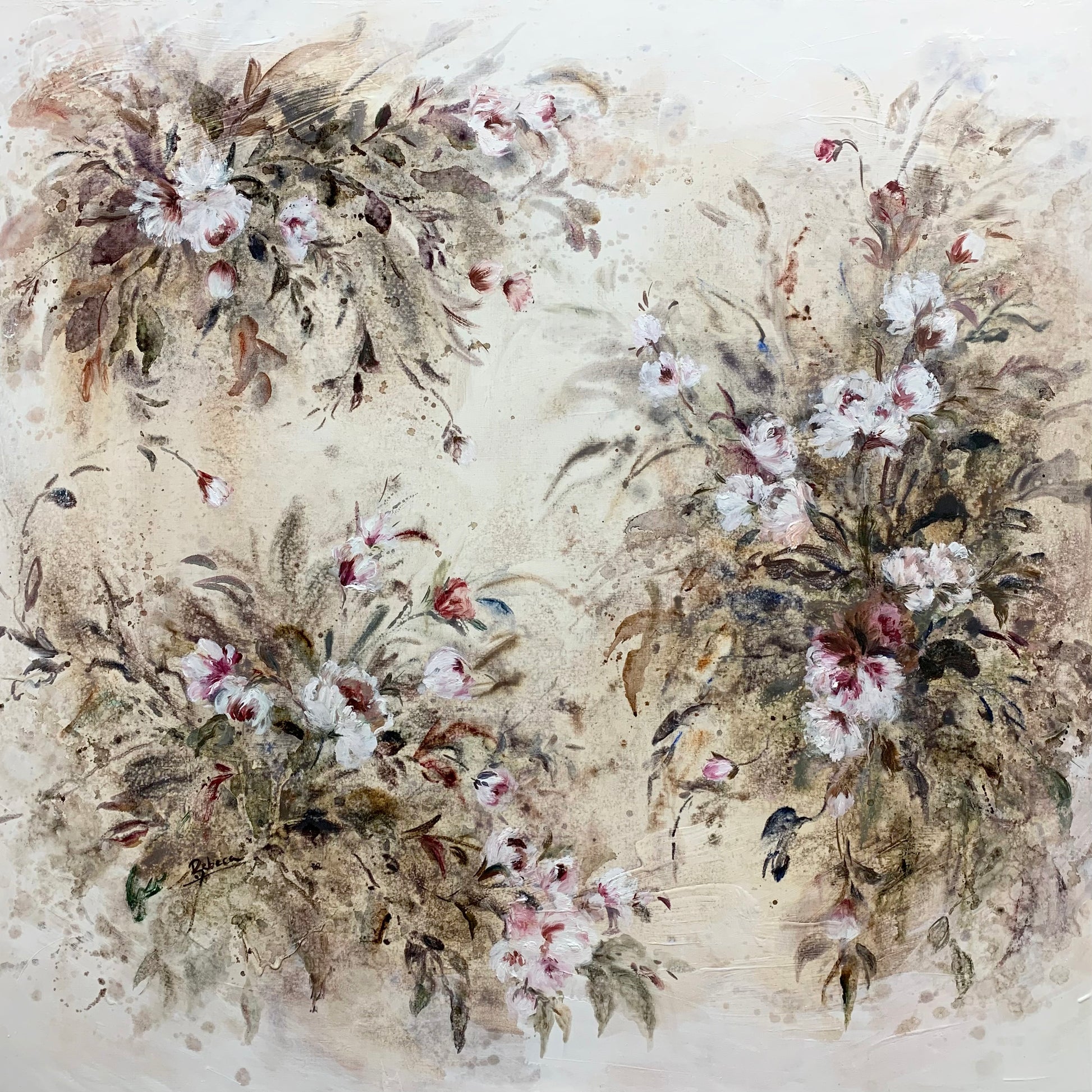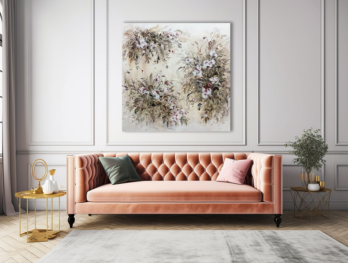 F233, es una bellísima composición floral en 3 grupos. Sus colores en tonos tierra, blanco y rosa, forman un conjunto dulce y armonioso en un formato cuadrado, tan peculiar como original. Esta obra emana romanticismo, ternura y amor por la naturaleza, la libertad, la levedad. Como simbolismos ponemos encontrar, la trinidad (número 3), la tierra como fertilidad, la flor como fruto, la conexión, la reproducción, o el ciclo de la vida, entre otros.
