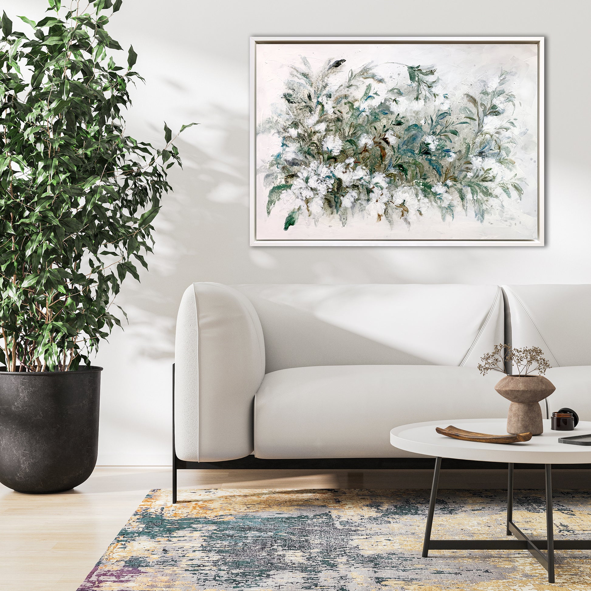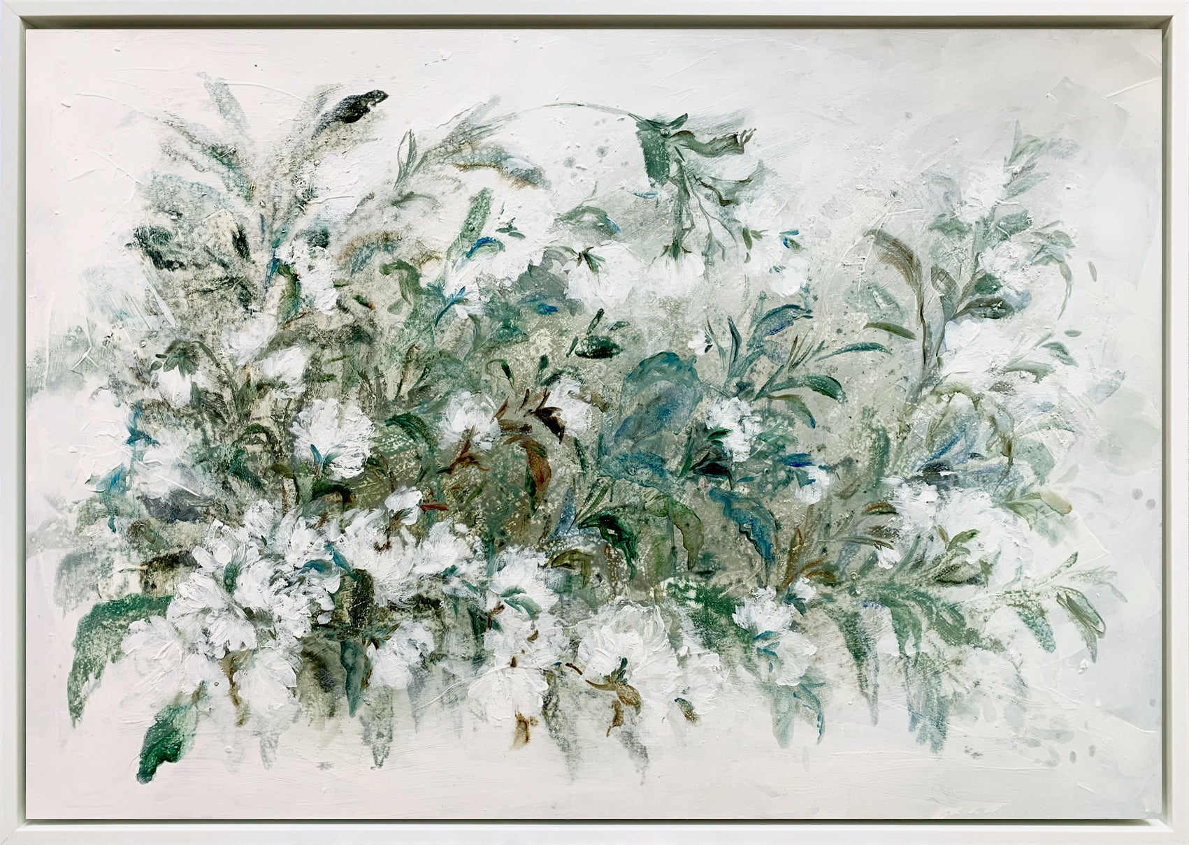 F234, es una obra romántica que combina la naturalidad de los colores verde, marrón y blanco en la naturaleza, creando una rosaleda, que parece danzar al son del viento. Las flores blancas se disuelven con el fondo, al igual que las hojas que se van fundiendo con el mismo. Su movimiento se delimita con la dimensión del cuadro sin sentirse "cerrado". Emana frescura, movimiento, libertad y ligereza. Por su tamaño mediano es ideal para cualquier estancia.