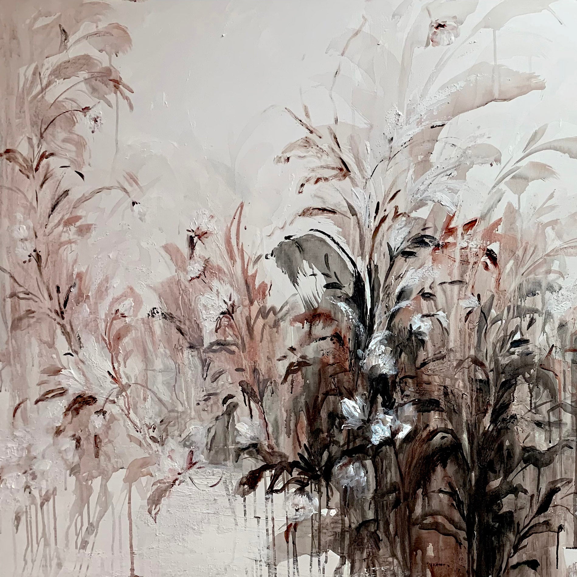 F243, es una obra sutil en color, pero imponente en tamaño, 2 metros de largo x 1 metro de alto, hacen que no pase desaperciba. Aun así tu tonalidad compuesta solo por negro, marrón y blanco, la hacen ideal para sutileza y elegancia a cualquier estancia, sus flores blancas y el lago donde descansan dan frescura a la obra, la hojasca en tonos fuertes y sutiles crea capas posicionando elementos más cerca y otros más lejanos, creando un paisaje natural, irreal y bello.