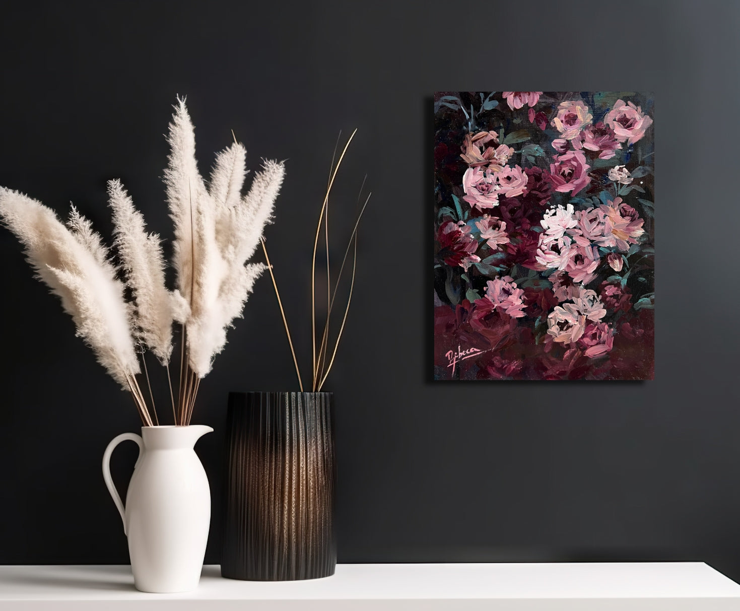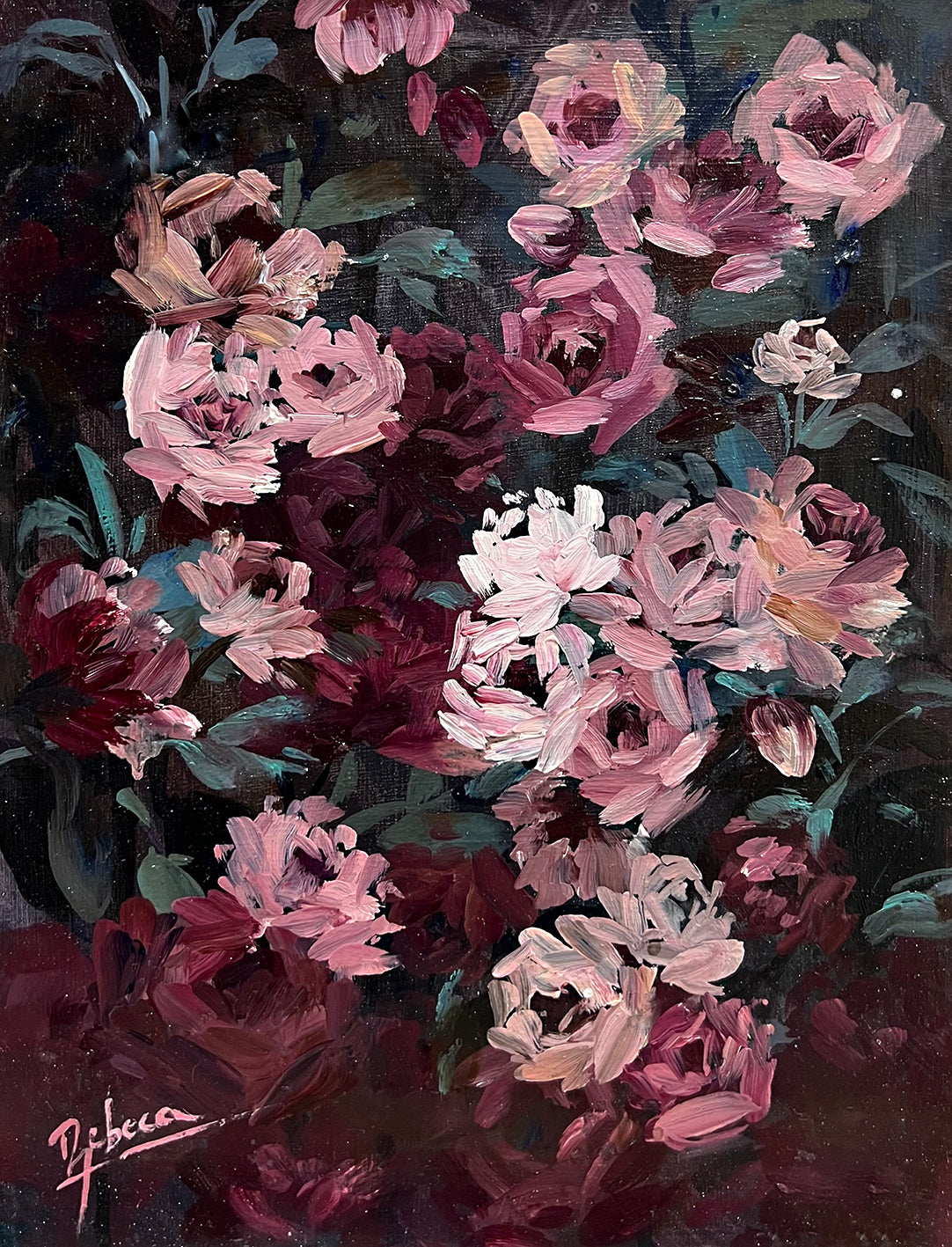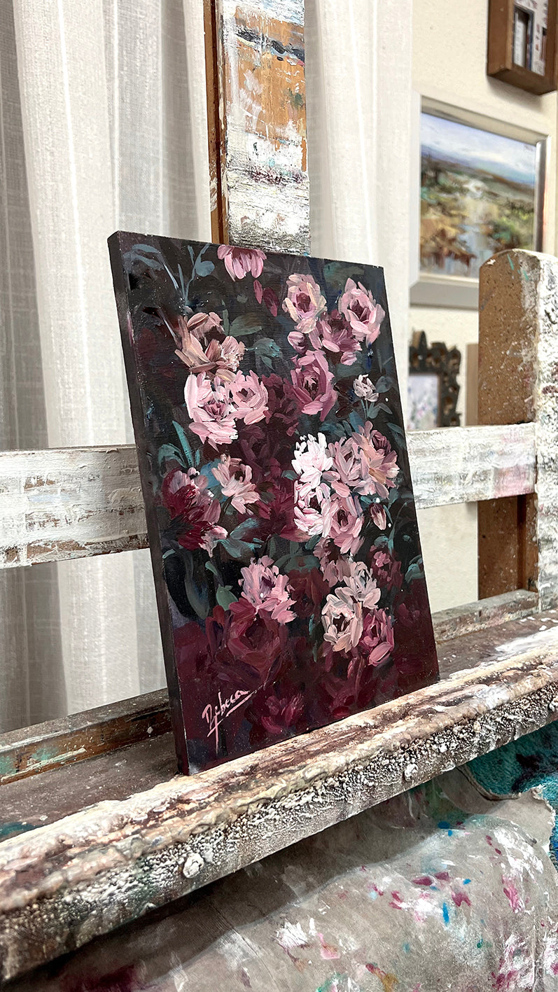 F249, es la representación de un rosal en miniatura. Sus flores en blancos y rosas destacan sobre el fondo oscuro de las hojas, creando capas de profundidad y misterio. Una obra completamente impresionista, con un matiz más clásico. Para los amantes de la pintura vintage. Se puede colgar o apoyar en vitrinas, mesas, escritorios o estanterías. Si se va a colgar, recomiendo que sea en espacios delimitados, por ejemplo, columnas, o paredes estrechas, o junto a algunas obras, creando un grupo.
