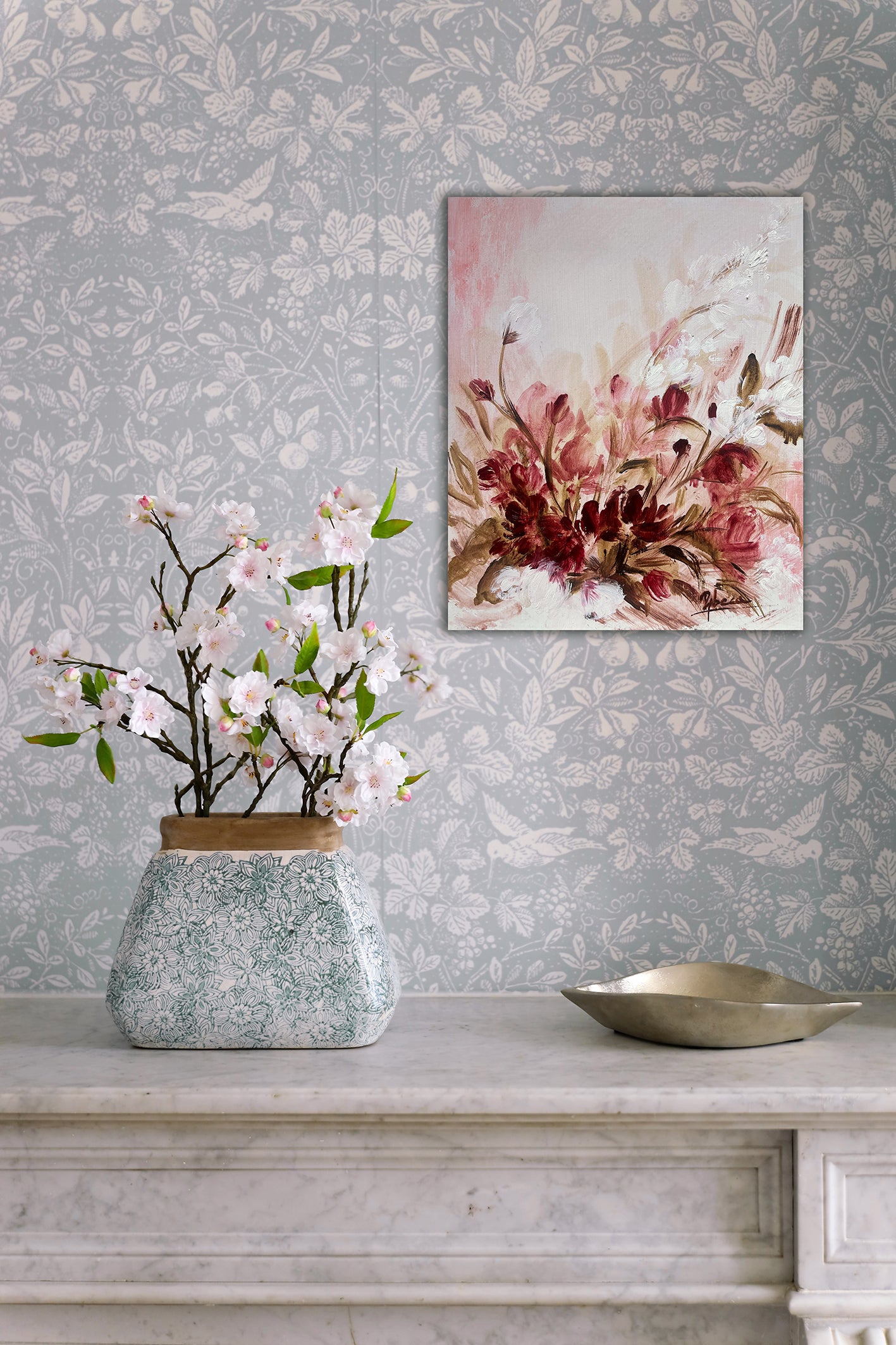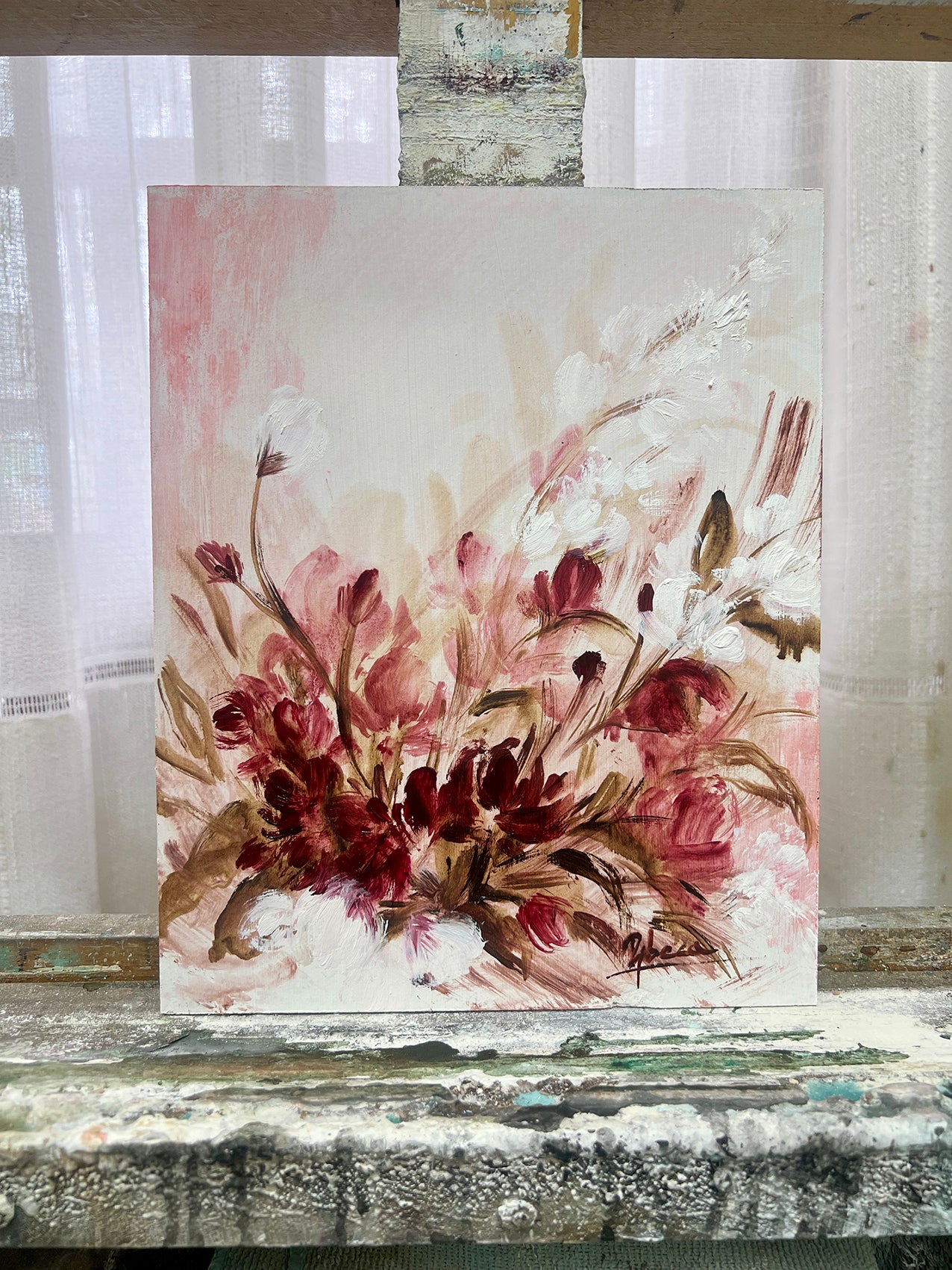F255, es una obra mini, compuesta de flores en rosa y blanco y con hojarasca en marrón. Ideal para romanizar cualquier espacio. Perfecta para quienes buscan añadir un toque de romanticismo y refinamiento a sus espacios, esta pieza versátil se adapta a múltiples contextos decorativos. Su tamaño compacto la convierte en la opción ideal para estanterías, pequeñas columnas, mesas de escritorio o cualquier rincón que requiera un acento artístico. La técnica del óleo sobre tabla garantiza una obra de calidad que perdurará en el tiempo, transformando ambientes cotidianos en espacios cargados de belleza y sensibilidad artística.