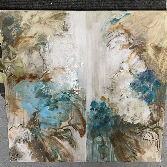 F272, compuesta por dos piezas de acrílico y óleo sobre tabla con unas dimensiones de 80x40cm cada una. Combina tonos marrones, azules y blancos, con una mezcla de líneas y materia y agilidad con los pinceles que le da a las flores un efecto más abstracto y un toque de frescura y originalidad. El efecto desgastado y fluido le brinda un aspecto dinámico y contemporáneo. La línea combina con la materia, creando un símil entre lo presente y lo imaginado, el dibujo y lo real. Añade expresión y fuerza a la composición. La flor, por su parte rota y desgastada, sigue siendo bella, etérea, que junto al halo blanco, da esperanza, optimismo y promesa de ver la luz.