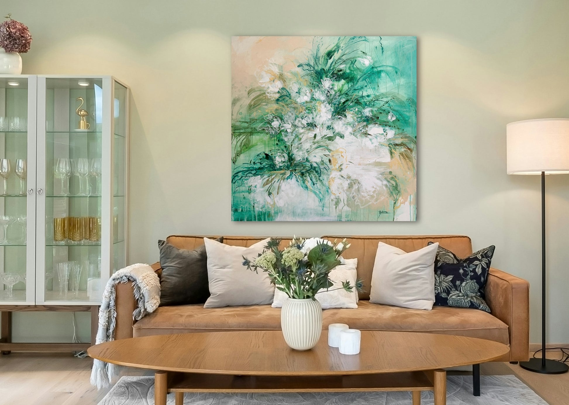 F273 es una obra de técnica mixta sobre tabla de 100x100 cm que destaca por su composición cuadrada y su vibrante paleta de colores, donde predominan el verde, turquesa, blanco y beige. La pieza combina con maestría, materia y líneas para representar hojas y una flor, creando un efecto dinámico y elegante. Su audaz juego cromático y formal evoca la energía de una jungla exuberante fusionada con la delicadeza de una rosaleda de rosas blancas, transmitiendo una sensación de vida y movimiento que invita a la contemplación y al descubrimiento.