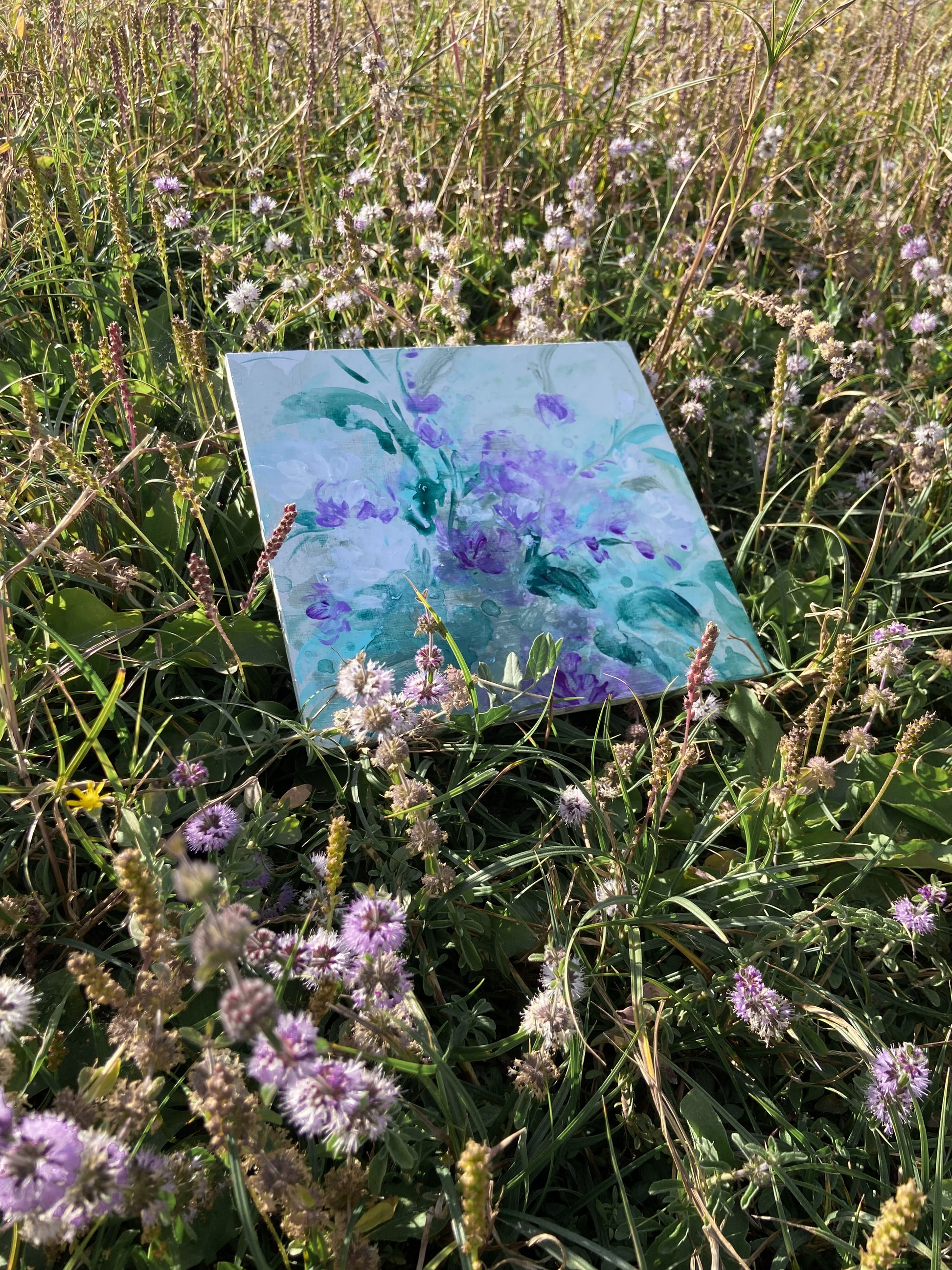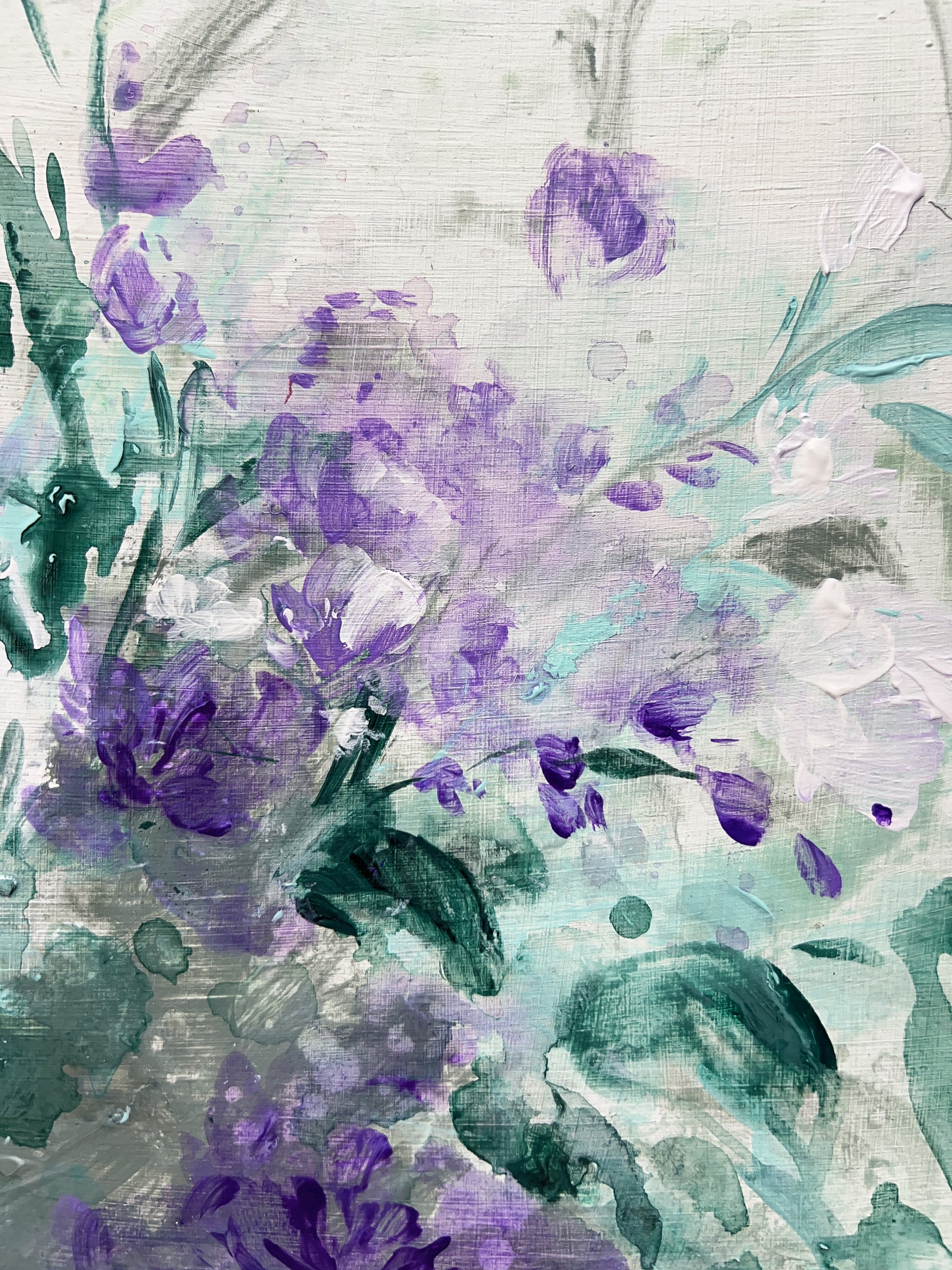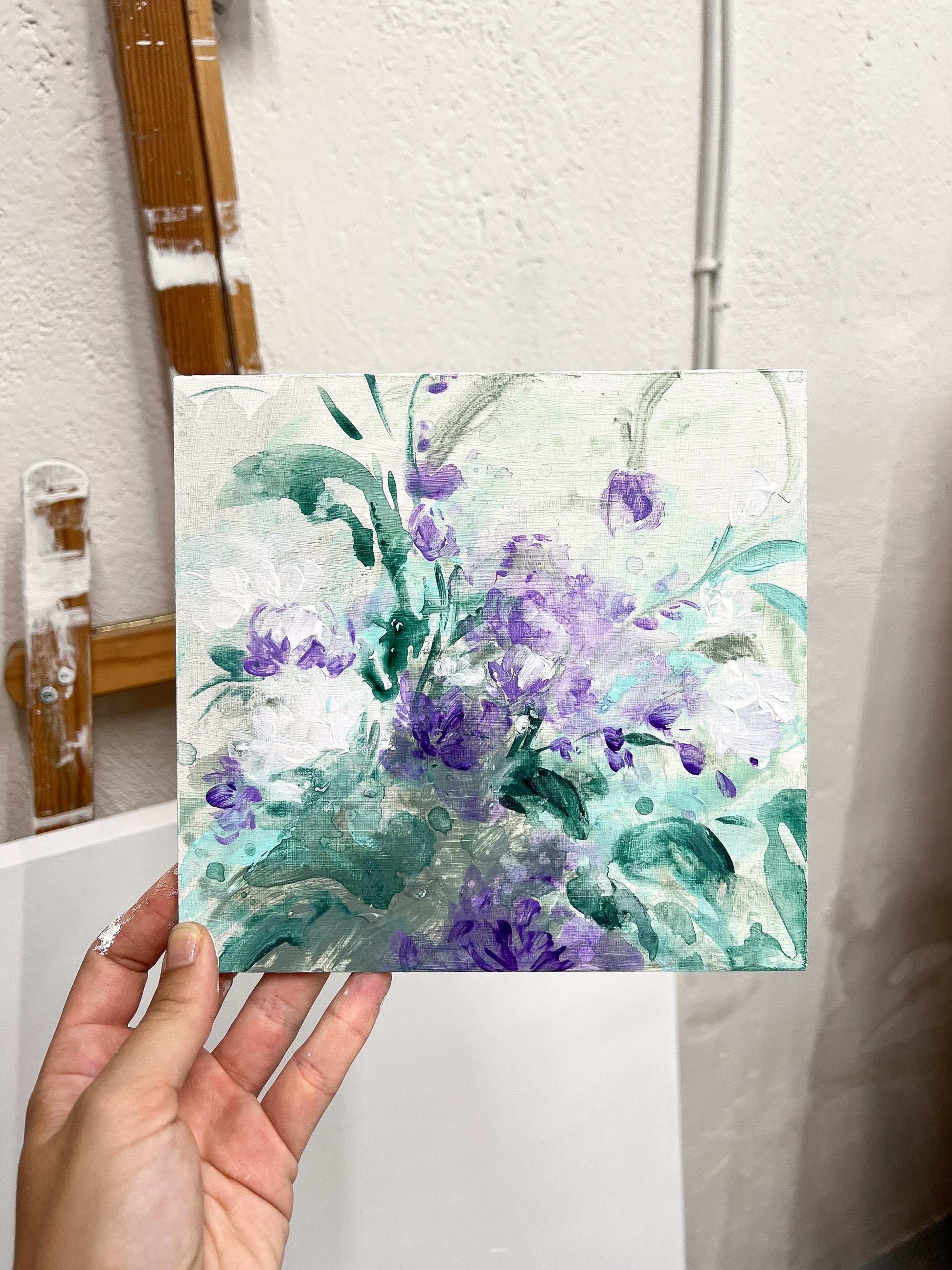 F275, esta obra mini, es ideal por su combinación de color dulce, en tonos lila, blanco y verde, crea una atmosfera que proporciona paz y melancolía. Ideal para los más románticos o amantes de estos colores. Su tamaño es perfecto para sobremesa, estanterías, columnas o juntos otros elementos de decoración.