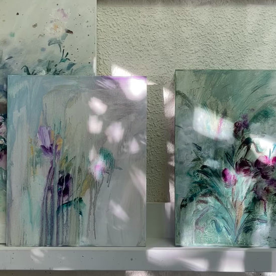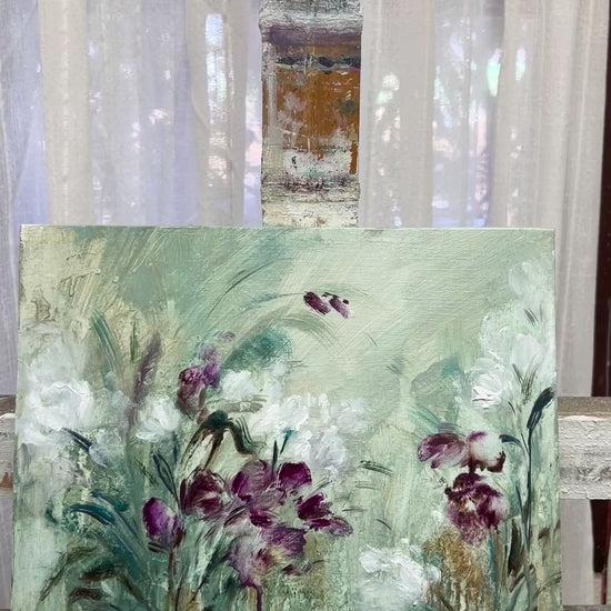 F281, es una sutil fantasía un jardín de ensueño en tonos verdes, morados y blancos.